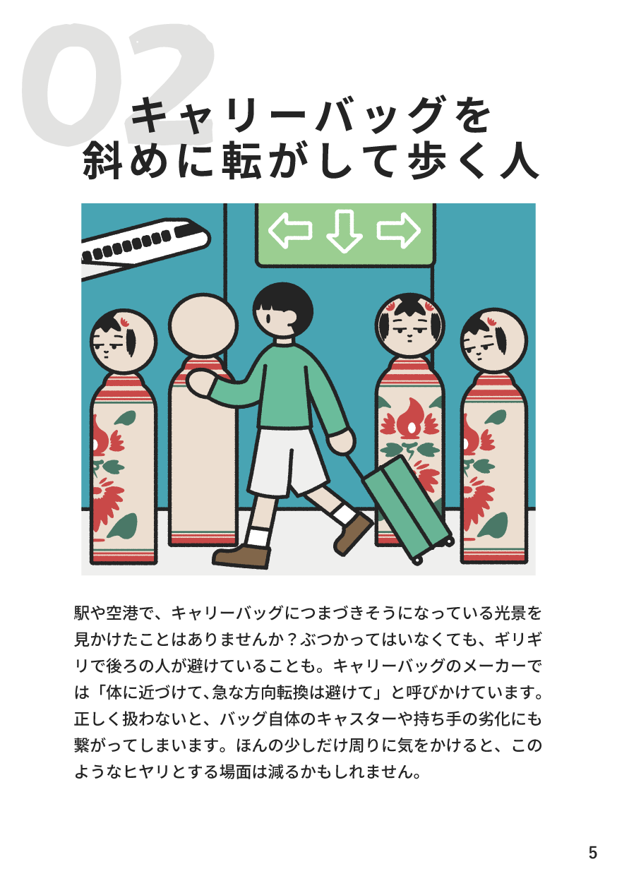 こけしたちが人を見守るように描かれ、「こけしの視線」でマナーを語るような構成です。