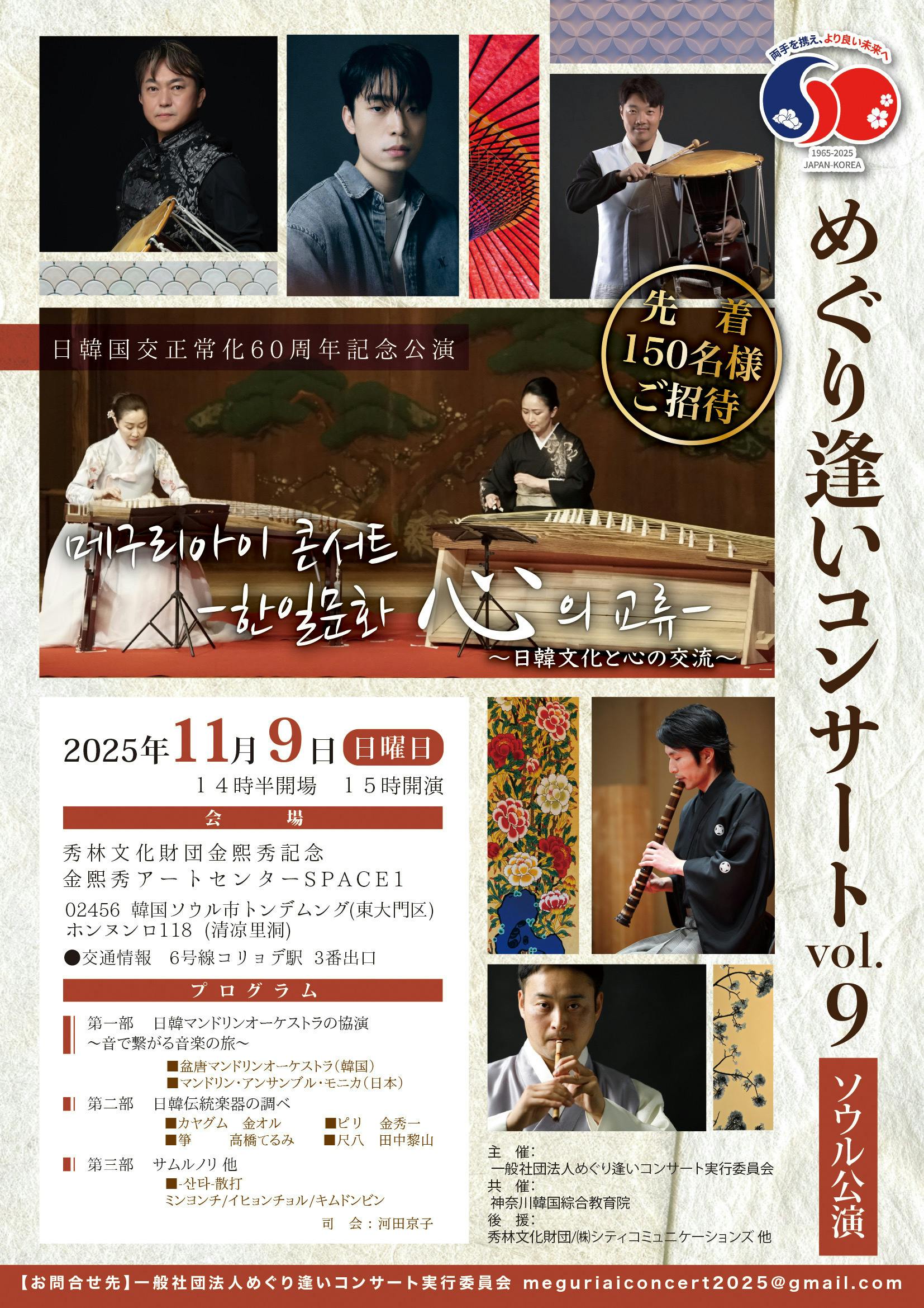 そして2025年は「日韓国交正常化60周年」を記念し、【11月9日に韓国ソウル】で日韓文化交流イベント『めぐり逢いコンサートvol.9ソウル公演』を企画、開催する運びとなりました。