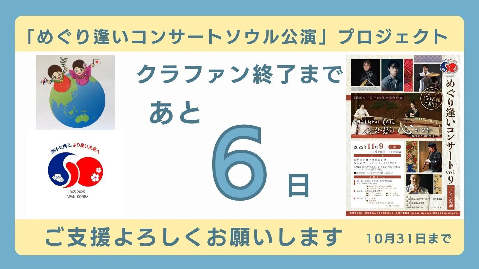 2025/10/25 17:57クラファン終了まで、【あと6日】となりました!皆さま、温かいご支援・応援を本当にありがとうございます。おかげさまで現在、目標達成率【69%】まで到達しました!日韓国交正常化60周年記念 日韓文化交流イベント『めぐり逢いコンサート vol.9ソウル公演』プロジェクトの挑戦も、いよいよ終盤です。このプロジェクトは、音楽を通して日本と韓国の心をつなぐ架け橋になりたいという想いから始まりました。ソウルでの公演を実現させ、これまで積み重ねてきた「めぐり逢い」を未来へとつなげたい。これまでの”めぐり逢い”を、60周年という節目にソウルで形にできるよう、メンバー一同、最後まで全力で取り組んでまいります。残り【6日】。最後の一押しが大きな力となります。まだご支援を迷われている方、そしてすでに応援くださっている皆さまも、どうかこのプロジェクトの拡散・シェアでお力をお貸しください。皆さまと共に、この特別なコンサートを成功させられることを願っています。引き続き、どうぞよろしくお願い申し上げます。心からの感謝を込めて。めぐり逢いコンサート実行委員会 もっと見る