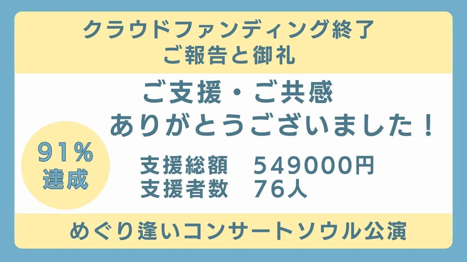 2025/11/02 21:08ご支援くださった皆さまへこのたび、「日韓文化交流イベントめぐり逢いコンサートvol.9 ソウル公演」のクラウドファンディングが無事、終了いたしました。たくさんの温かいご支援と応援をいただき、心より感謝申し上げます。■クラウドファンディング結果• 期間:2025年9月8日〜10月31日• 目標金額:600000円 (日韓国交正常化60周年にちなみ)• 達成金額:549000円(達成率91%)• 支援者数:76名皆さまのご支援のおかげで、ソウル公演に向け準備を進めています。ステージを通じて、音楽という共通の言葉で日本と韓国の心をつなぐ時間を共有できることは、私たちにとって何よりの喜びです。■ソウル公演今回のご支援を通じて、多くの方々の想いとともに、いよいよソウル公演を【11月9日】に開催いたします。日本と韓国の音楽・文化を通じて心がめぐり逢う時間をお届けできるよう、出演者・スタッフ一同、力を合わせて進めてまいります。今後も、皆様とのつながりを大切にし、ソウル公演の詳細や当日の様子は、随時お知らせいたします。引き続きご支援をよろしくお願いいたします■リターン(ご支援特典)についてリターン品の準備を順次進めてまいります。改めてご案内いたしますので、今しばらくお待ちいただけますと幸いです。■最後にこのプロジェクトは、皆さまお一人おひとりのご支援があって進めることができました。改めて心より御礼申し上げます。今後も「めぐり逢いコンサート」を通じて、日韓の友好と文化の架け橋を築いてまいります。引き続きあたたかいご支援をどうぞよろしくお願いいたします。一般社団法人めぐり逢いコンサート実行委員会 もっと見る