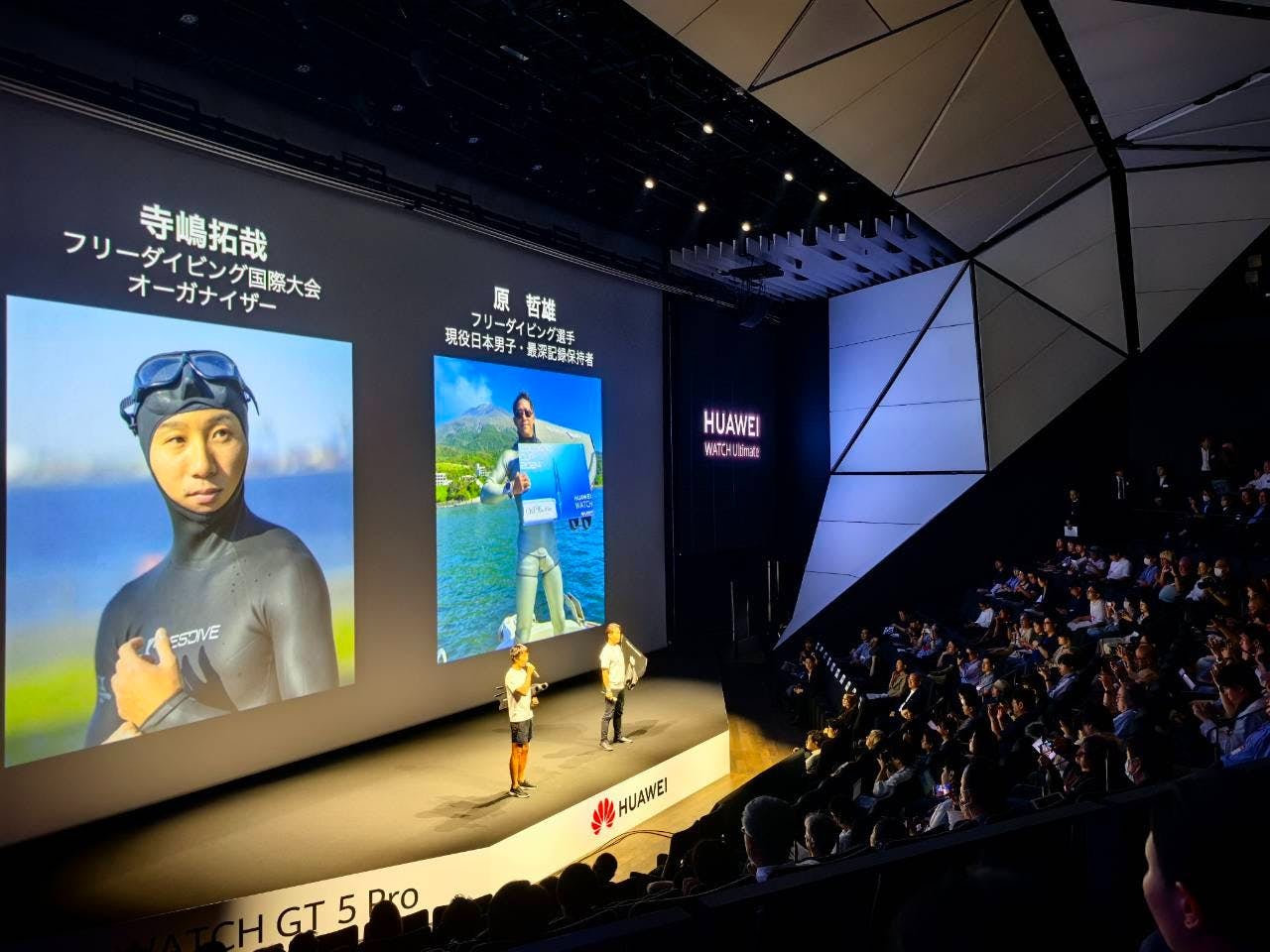 (↓HUAWEI JAPAN 2024年下半期フラッグシップ新製品発表会でVolcanoCupオーガナイザー寺嶋拓哉と2024年フリーダイビング国際大会に出場したフリーダイビング選手原哲雄選手が登壇している様子)