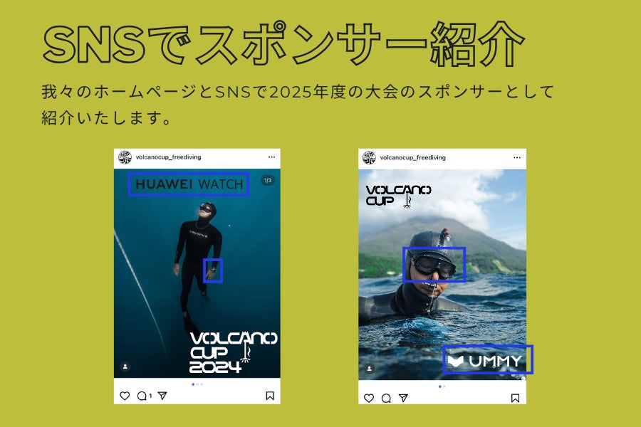 2025年度のフリーダイビング国際大会の大会スポンサーとしてSNSで紹介いたしたり、大会時にロゴを掲載いたします。