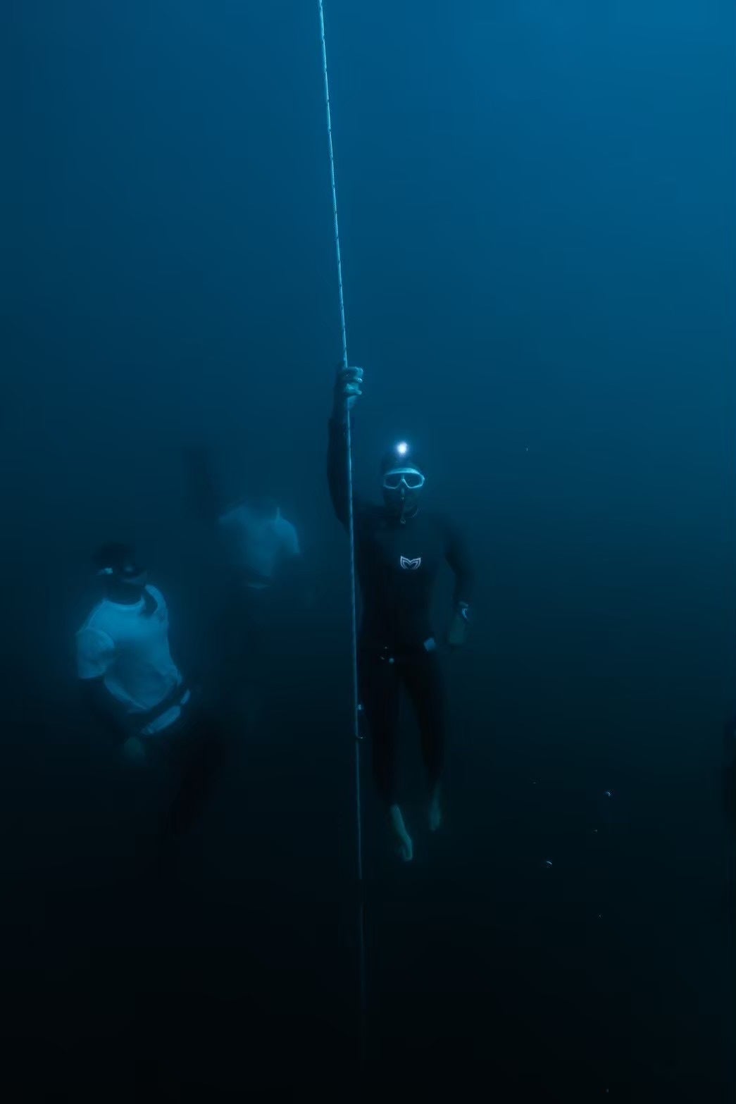 (↓黒いウェットを着ているダイバーが競技者で後方にいる白いシャツを着ている2人のダイバーがセーフティーダイバーです。)