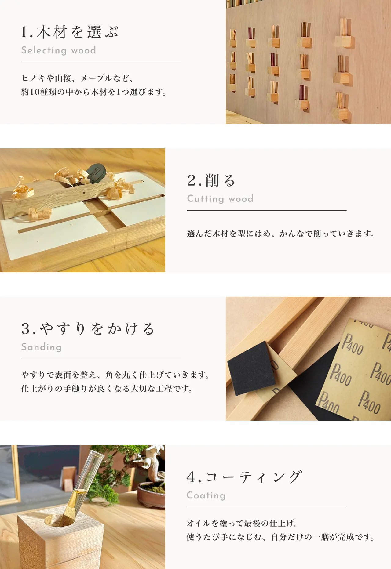 お箸は、形・素材・所作に日本らしさが詰まった“和の象徴”のひとつ。お箸作りという体験を通して、木の香りやぬくもりを感じ、家族や友人、大切な人と一緒に、記憶に残る和文化を体験していただきたいと思っています!