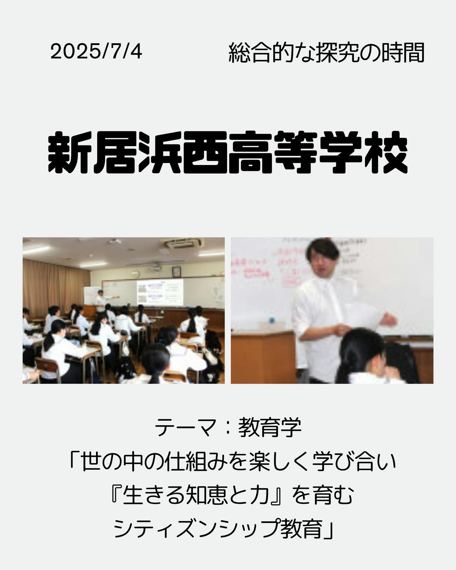 2025/08/04 20:00「なぜ勉強しなければいけないの?」教育を「自分ごと」にするシティズンシップ教育2025年7月4日、愛媛県立新居浜西高等学校にて、高校2年生を対象とした“仕事とキャリアの教育”の特別授業「これからの『学び』の話をしよう!」を実施しました。今回のプログラムでは、「なぜ勉強するのか?」「教育とは何か?」「社会とどう関わるのか?」といった問いを軸に、生徒一人ひとりが“納得解”を探る参加型の学びを体験しました。Lesson 1:【シティズンシップってなに?】授業の冒頭では、「シティズンシップ教育・主権者教育とは何か?」をテーマにしたスライドトークが行われました。「若者の投票率が低いのは誰のせい?」「主権者教育って本当に“政治の話”だけ?」といった問いかけを通じて、生徒たちは市民としての役割や社会との関わり方を多角的に考えていきました。「今まで“選挙=難しいもの”と思っていたけど、自分にもできることがあると気づけた」「政治と教育がこんなにつながっているなんて驚いた」など、新鮮な驚きの声が多く聞かれました。Lesson 2:【レゴ式で考える】次に生徒の質問に答える形で授業を展開。現在の教育現場の現状や、教員になるために必要な資質や能力について、生徒とディスカッションをしました。生徒たちは与えられた問いに対し、互いの意見を尊重しながら対話的に考えを深めていきました。その中で、越智自身の経験も踏まえ、「これからの社会では“正解”を覚えるだけでなく、“自分なりの答え”をつくることが大切」というメッセージを伝ました。生徒からは、「パズルのように型にはめる考え方じゃなく、自分の形で学んでいいんだと安心した」「教育の話なのに、自分の将来や働き方までつながっていた」といった感想が寄せられました。生徒の声から(アンケートより抜粋)「教育は“大人に言われるからするもの”だと思ってたけど、全然ちがった」「人との関わりが人生に大きな影響を与えることに気づいた」「“パズル式からレゴ式へ”という言葉がずっと残っている」「シティズンシップ教育を、もっと多くの人に体験してほしいと思った」「目標を持たなくていいって聞いて安心した。生きやすくなった」まとめ:「納得解」を探す学びへ今回のプログラムでは、自分の経験を踏まえ、これから「教育機関」に縛られない、こども達の「先生」になっていく学生と“学び”について対話しました。若者がこれからの社会をどう生きるか。その出発点に、教育や政治、働く意味など、多様なテーマを通して“自分ごと”として向きあってもらえれば嬉しいなと思いました。主催愛媛県立新居浜西高等学校ご支援のお願いWONDER EDUCATIONの取り組みは、皆様のご支援によって成り立っています。ぜひご支援のほど、よろしくお願いいたします。▼ 銀行振込はこちら銀行:伊予銀行(0174)支店:本町支店(101)口座:普通(1)番号:3675663#シティズンシップ教育 #主権者教育 #こどもの権利 #キャリア教育 もっと見る