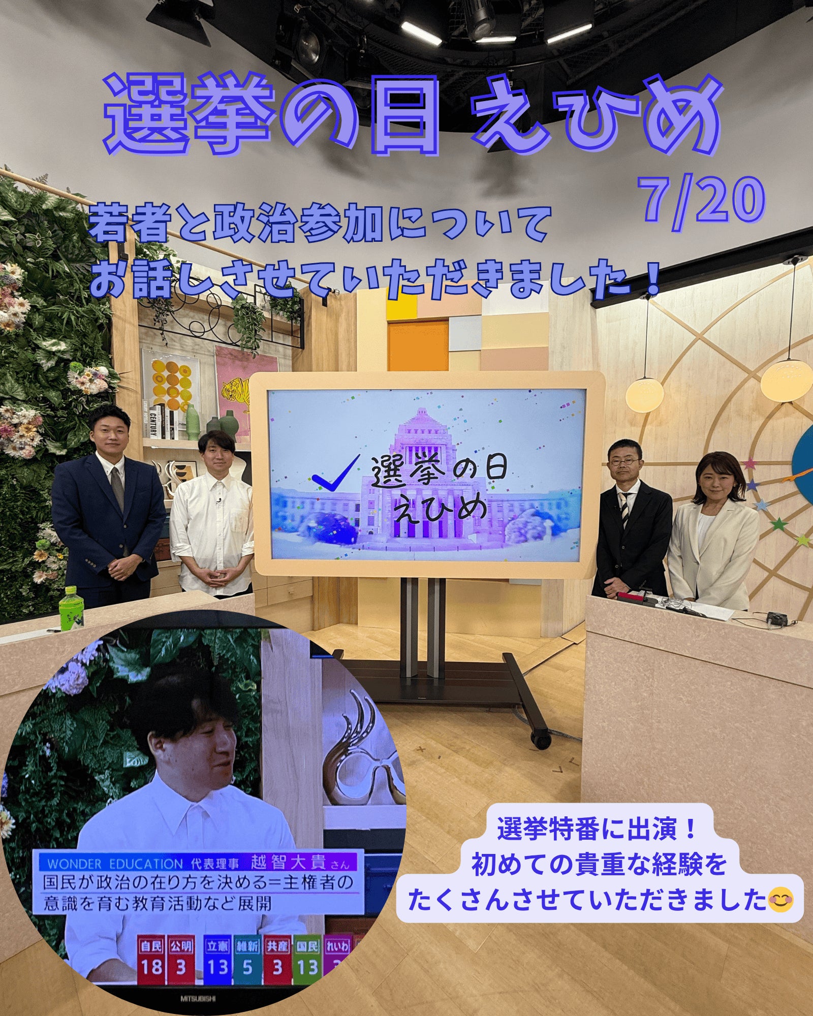 7月20日、参院選特番(あいテレビ)「選挙の日 えひめ」にて、愛媛選挙区の開票速報・情勢解説にゲスト出演しました!