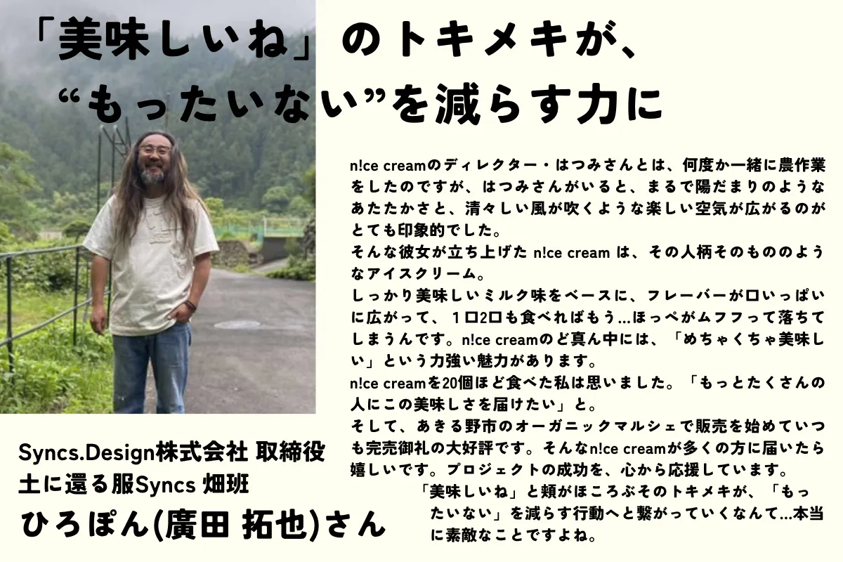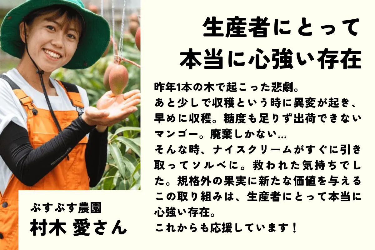 現在、規格外農産物を活用したアイスクリームブランド「n!ce cream」を立ち上げ、運営しています。
