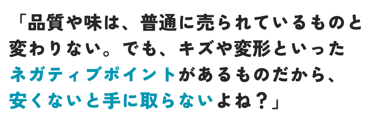 傷や変形、変色といった出荷規格を外れ、販売先に困ったことで廃棄になってしまうものや、余剰在庫により廃棄になってしまう農産物を活用しています。