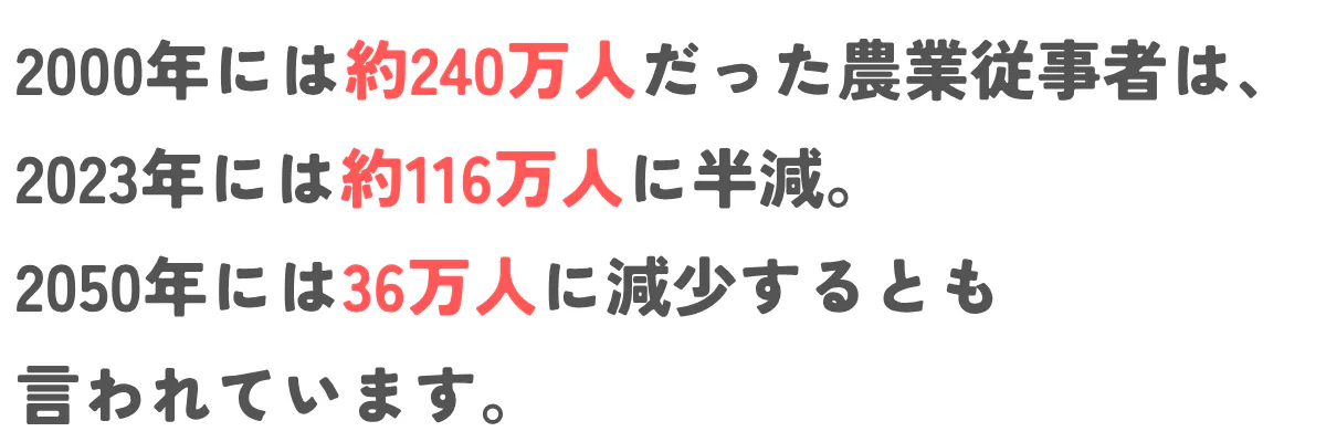 これ以上農家が減れば、国産の野菜や果物が手に入りづらくなる未来も容易にありえます。