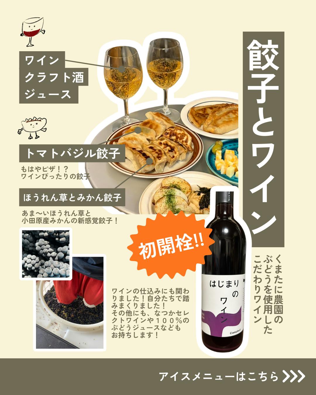 - ワイン: くまたに農園の葡萄で仕込んだ、はじめての自作ワインが登場!ぶどうジュースやオリジナルZINEなども販売予定。