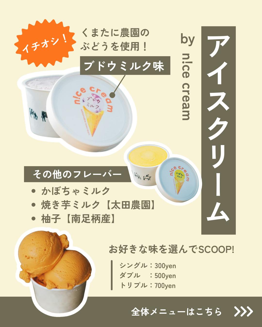 - アイス: n!ce cream 特製!くまたに農園の葡萄を使用したコラボフレーバー「ぶどうミルク」を楽しめます。その他フレーバーも提供予定。