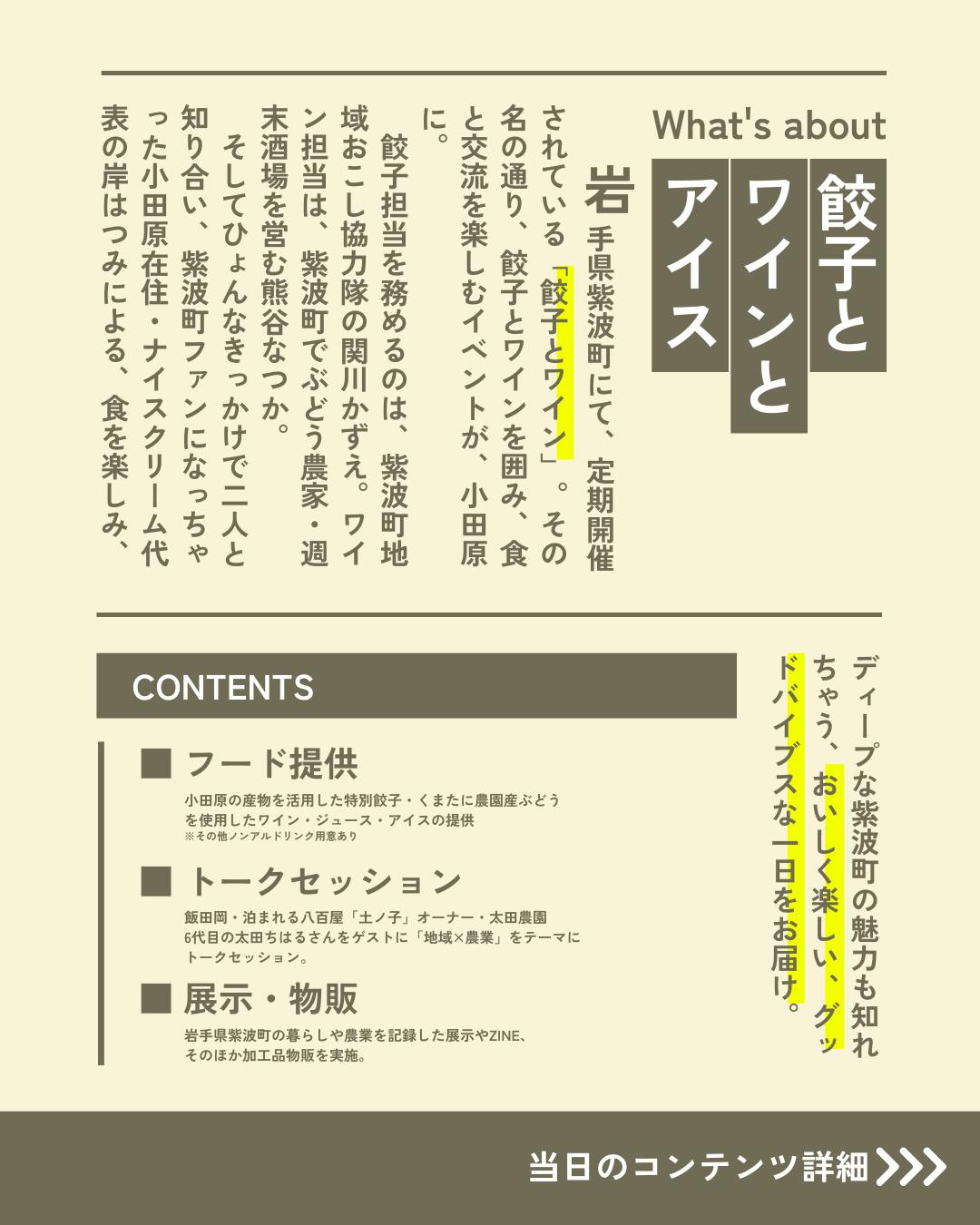 この度、岩手県紫波町から、農業と食を通じて地域を盛り上げる20代の若手農家・地域おこし協力隊を小田原に招き、一日限りのコラボイベント**「餃子とワインとアイス。〜農と食の親善外交〜」**を開催いたします!