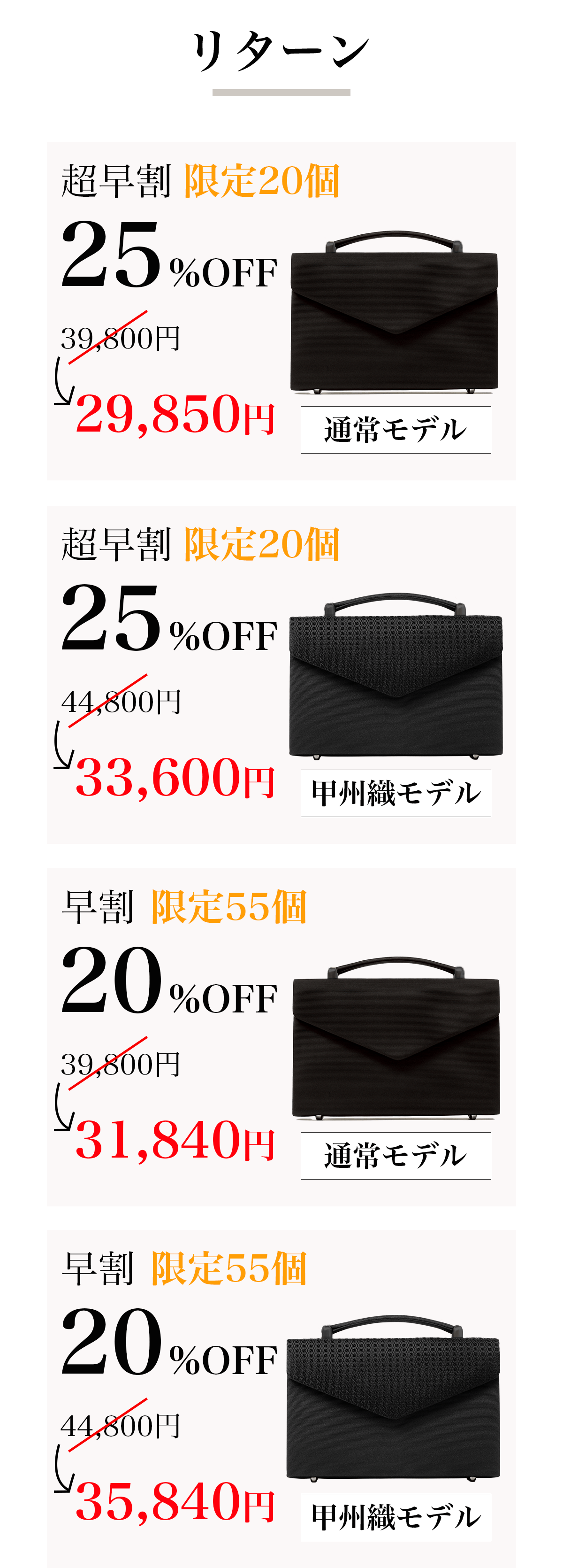 2025/09/27 20:00本日先行予約頂いたフォーマルバッグの発送が完了致したました。早ければ明日中、遅くても2、3日中にはヤマト運輸でお客様のもとへ届くかと思います。ブランド応援のお手紙、ノベルティは郵送にてお届けの予定です。ただ今準備中ですのでもう少しお待ちくださいませ。 もっと見る