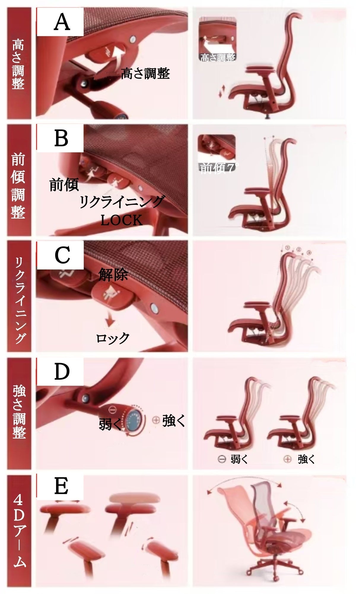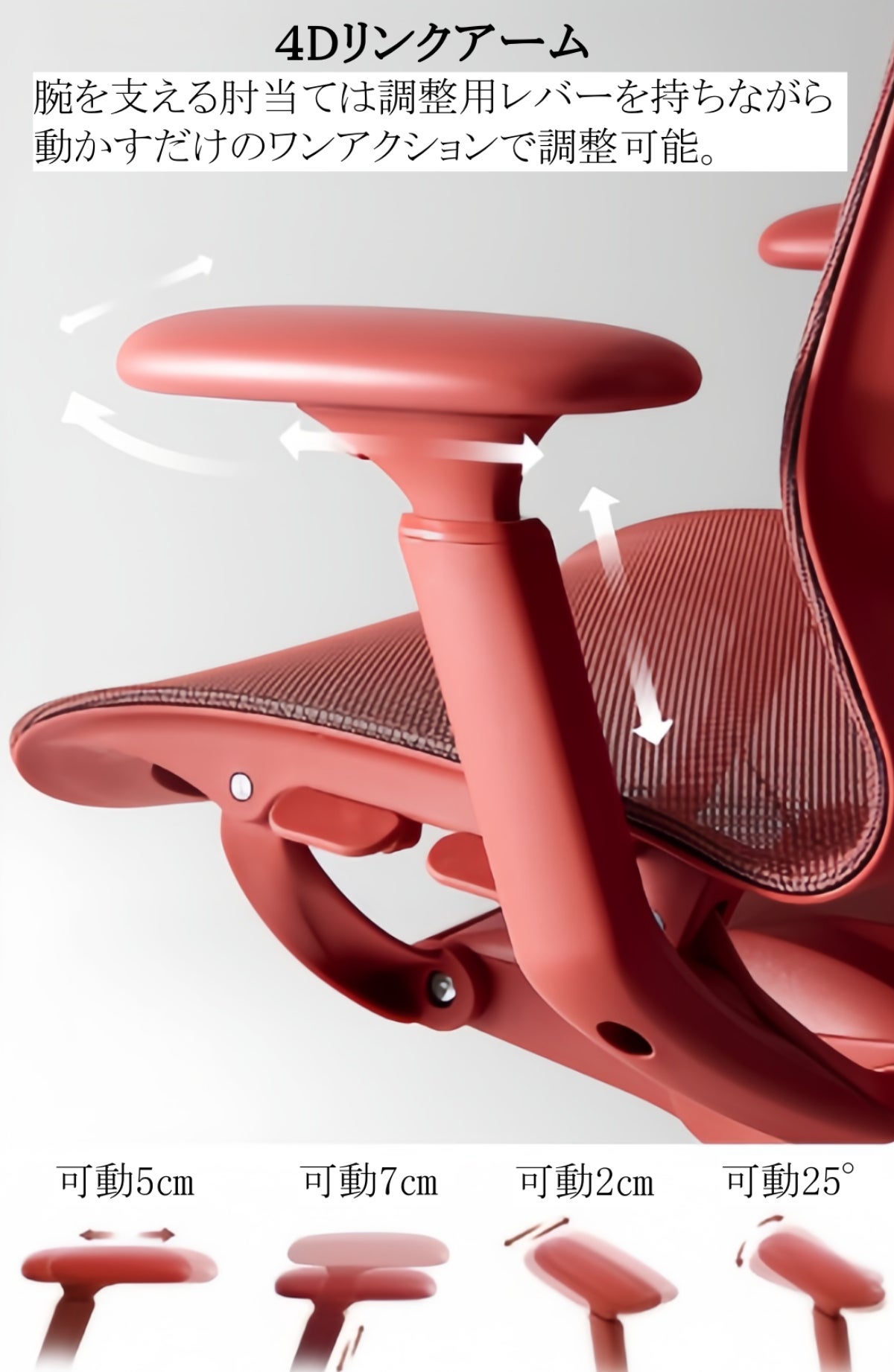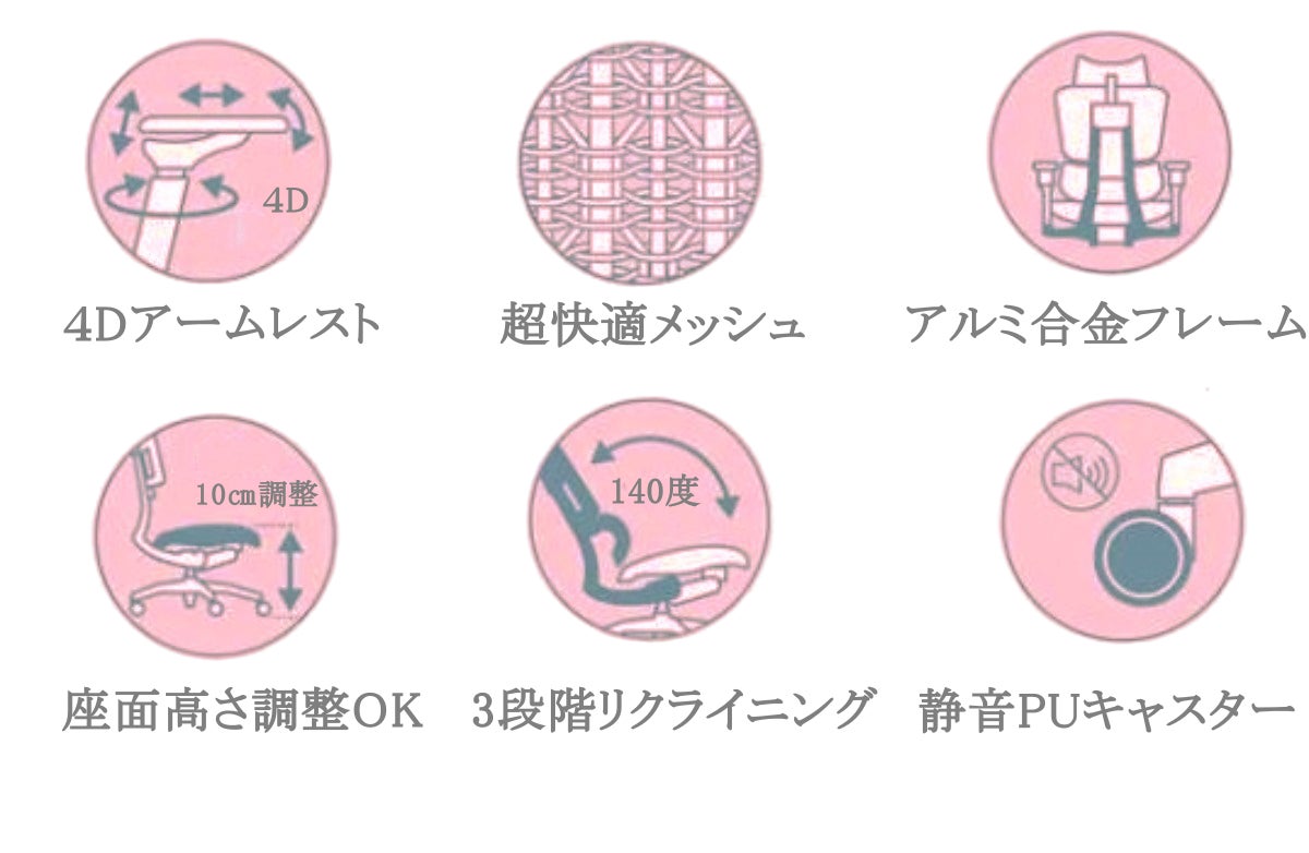 一体化成型技術で仕上げる座面、シンクロロッキング、シートアングルストッパー、ロッキング強弱簡易調節機能、ベンディングシート、4Dリンクアーム、SGS認証ガス上下調節、静音キャスター:ナイロンPU双輪キャスター