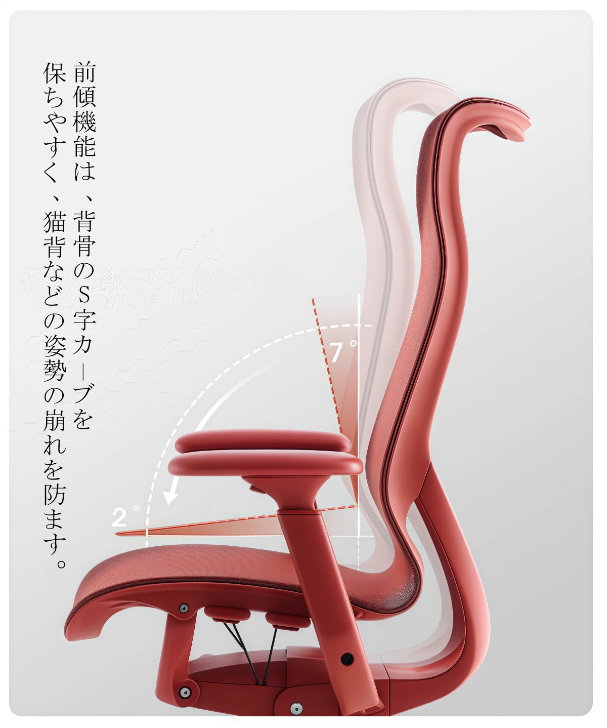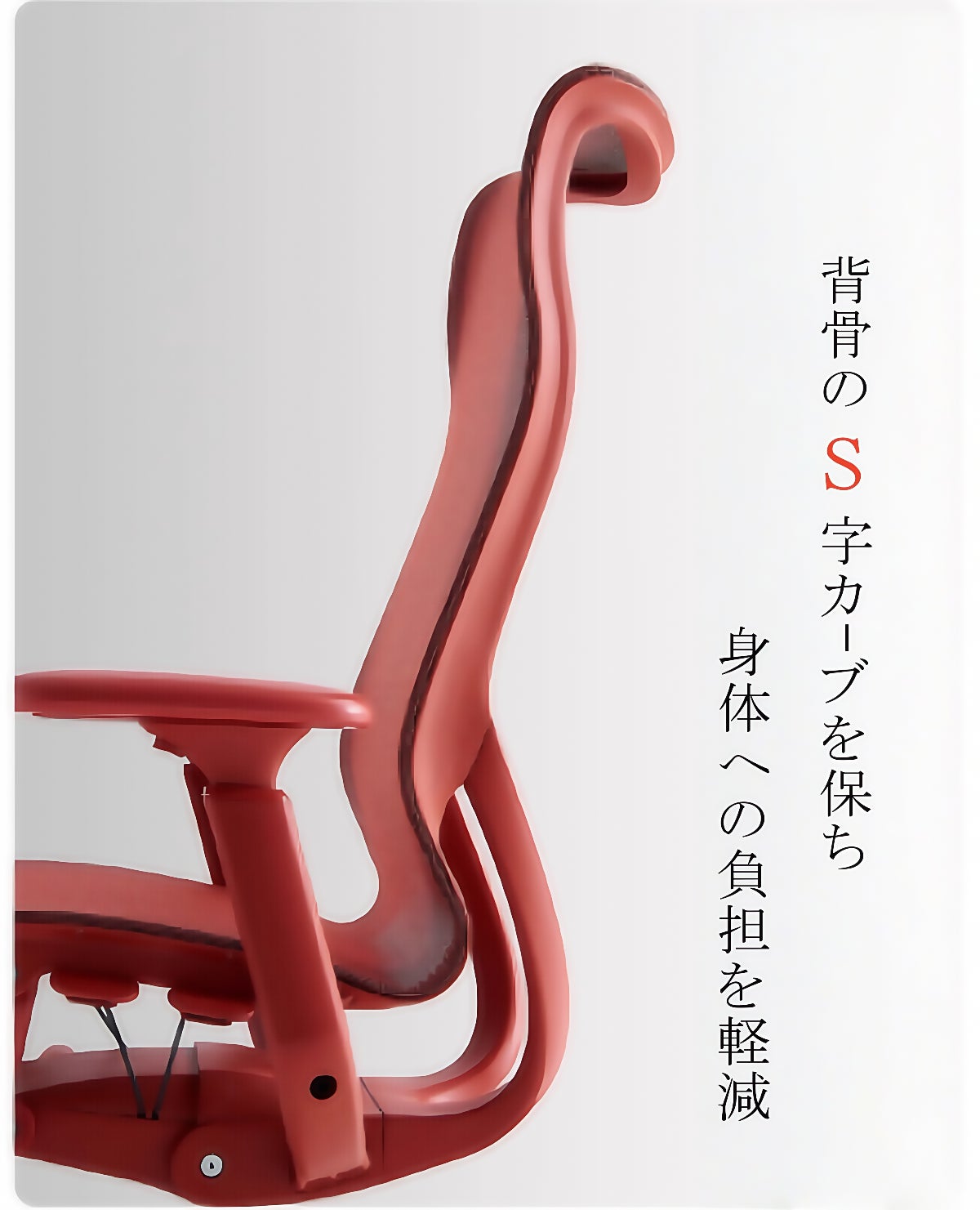 「背骨のS字カーブの維持」に着目。背骨の自然なラインに寄り添い、S字カーブを維持するように設計された背もたれによって、身体への負担を軽減します。