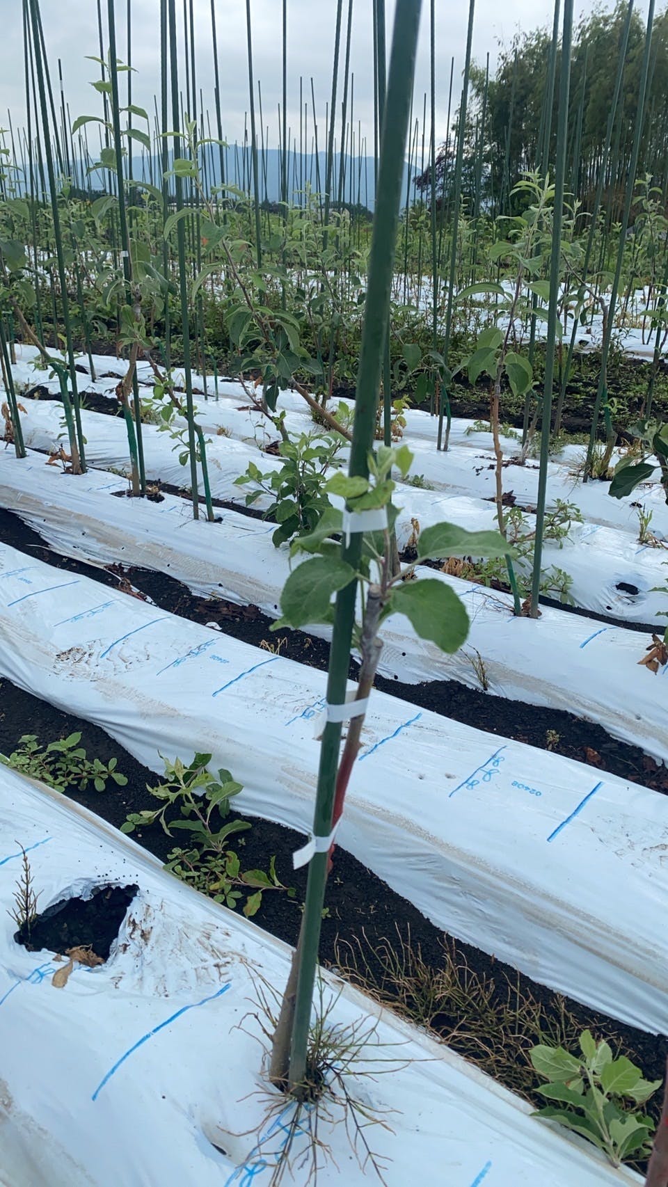 風などで倒れてしまわないように、1本1本支柱に苗を固定していきます