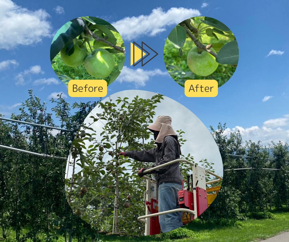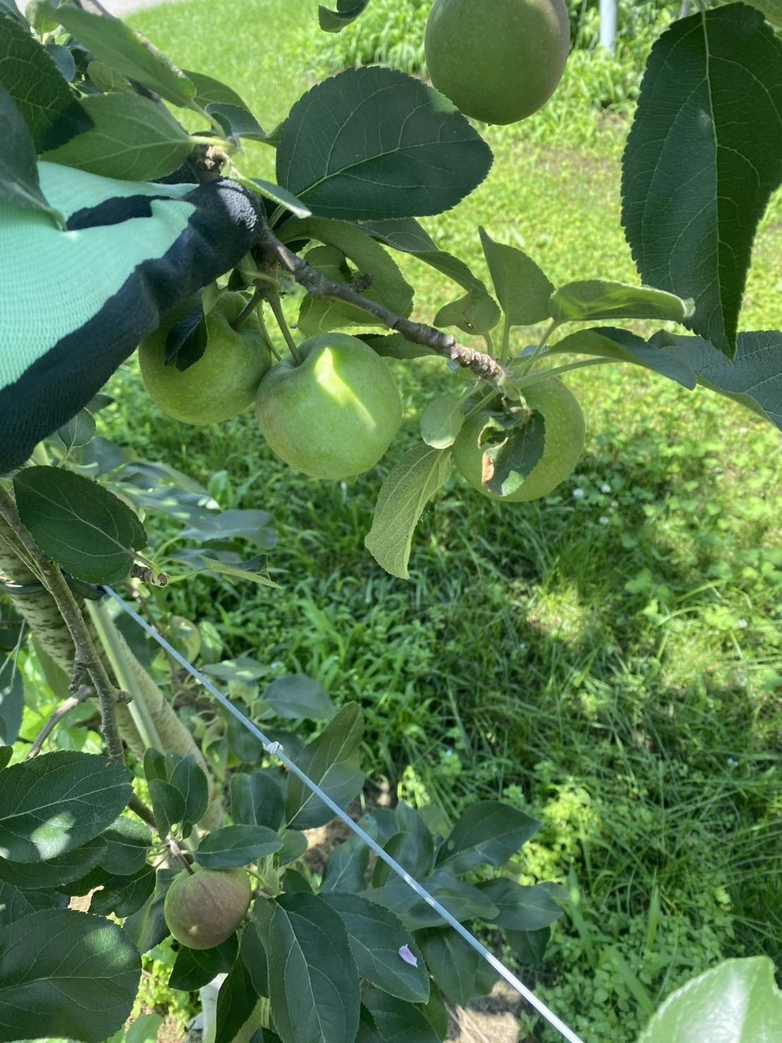 摘果は、よりよいりんごを育てるために、複数一緒についている実や、小さい実、形が悪い実などを1つ1つ見て、いい実を残します