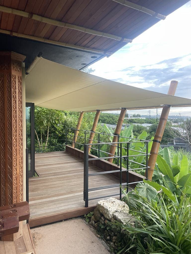現場はオープンに向けて着々と進んでおります!Baliのアンティークな手彫り木材や竹を使い、バルコニーは帆布の日除けでやわらかく心地良い空間になりました。まったりなリクライニングローチェアーを置く予定。読書や昼寝など、自分だけのオーシャンビューを堪能ください♪