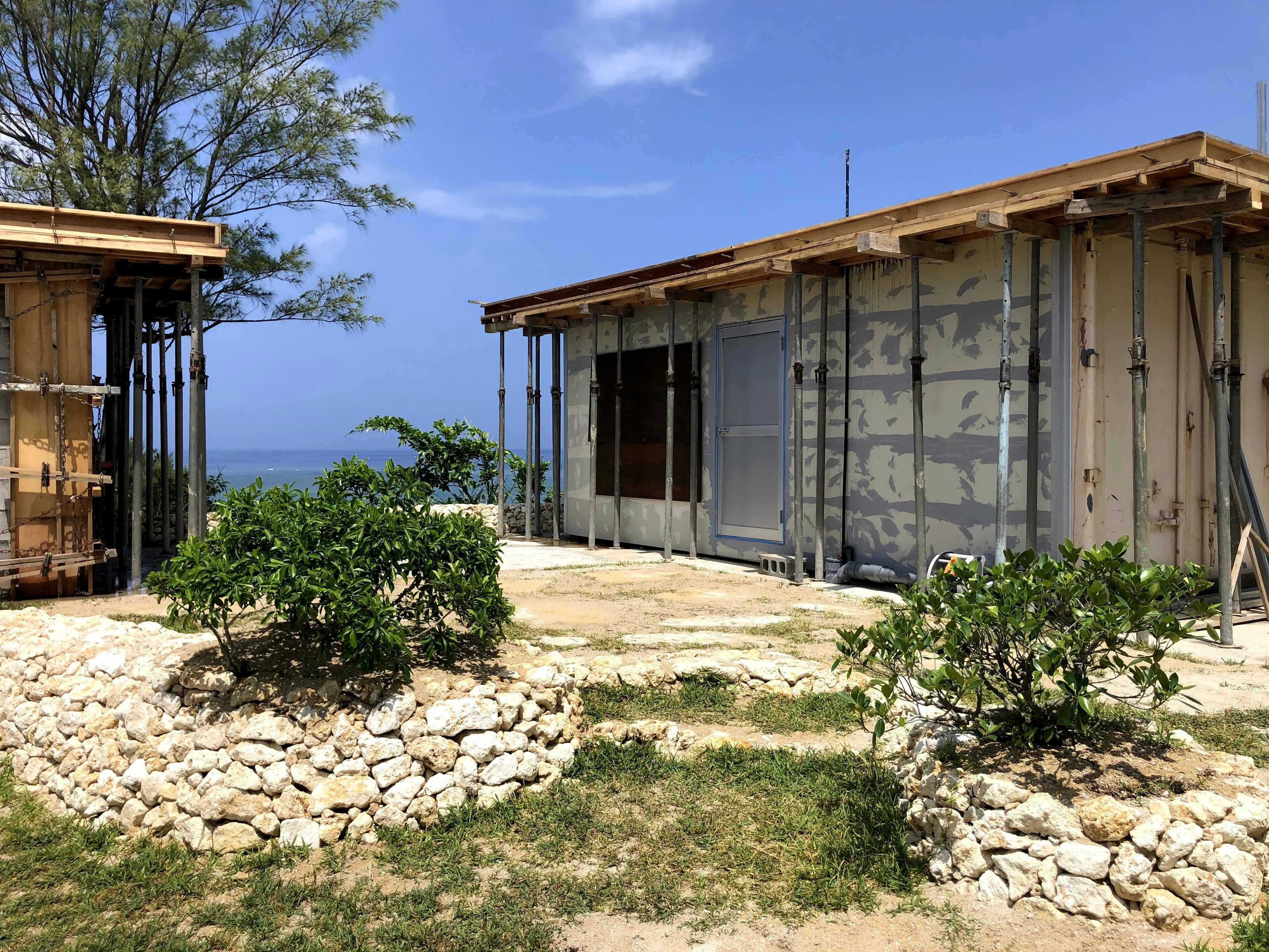 コンテナの固定にはRCを使い、もう一棟はCB造でシンプルなデザイン。戦後、米軍のために建てられた外人住宅のような雰囲気をただよわせ、沖縄の景観に昔からあるように馴染ませます。