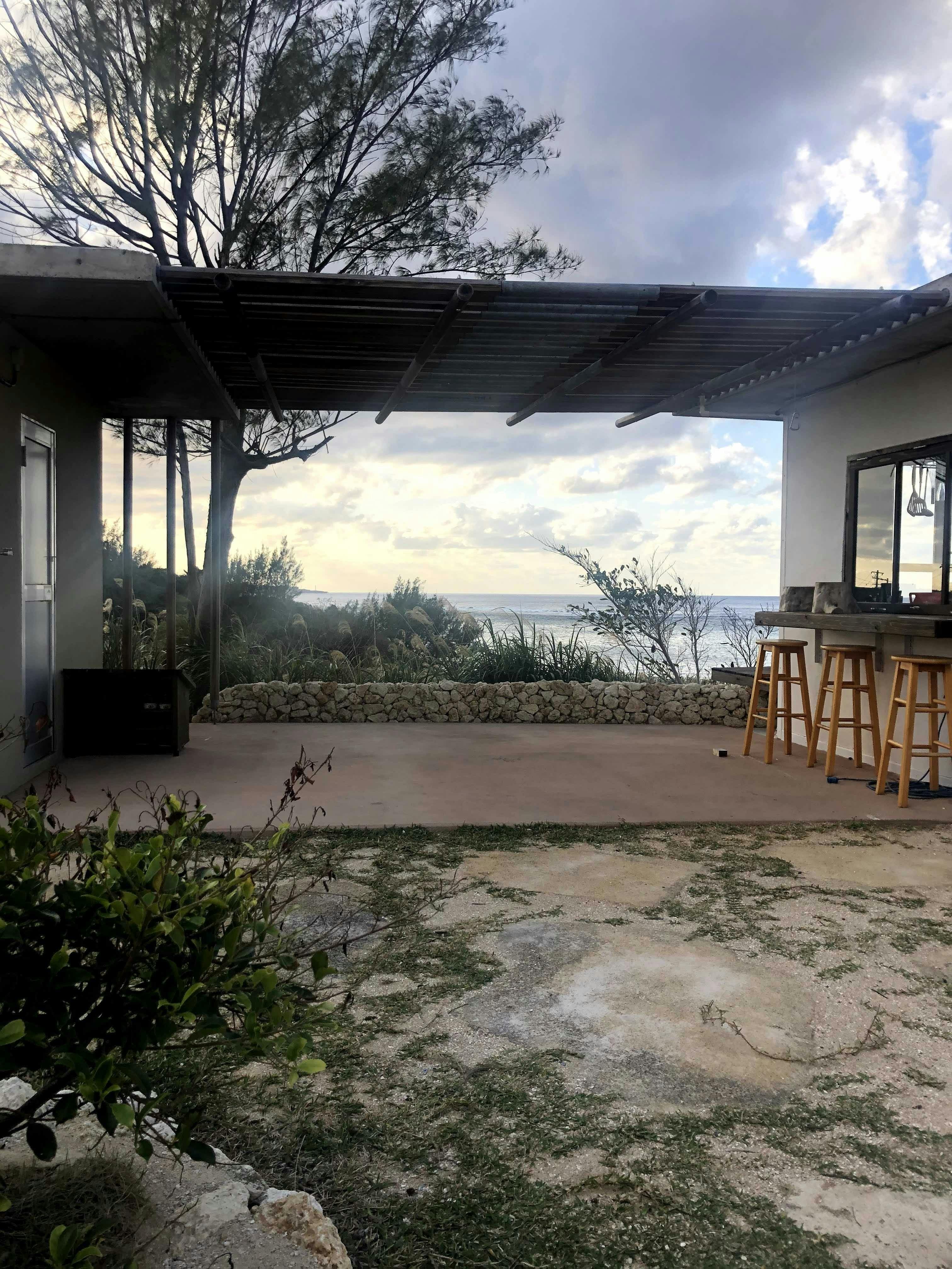 完成したタイニーハウスは、写真右のコンテナがキッチンとシャワー、トイレなど水回りが完備され、左の建物は寝室になり、中間のエリアがアウトドアリビングです。どの場所からも海を眺めることができます。
