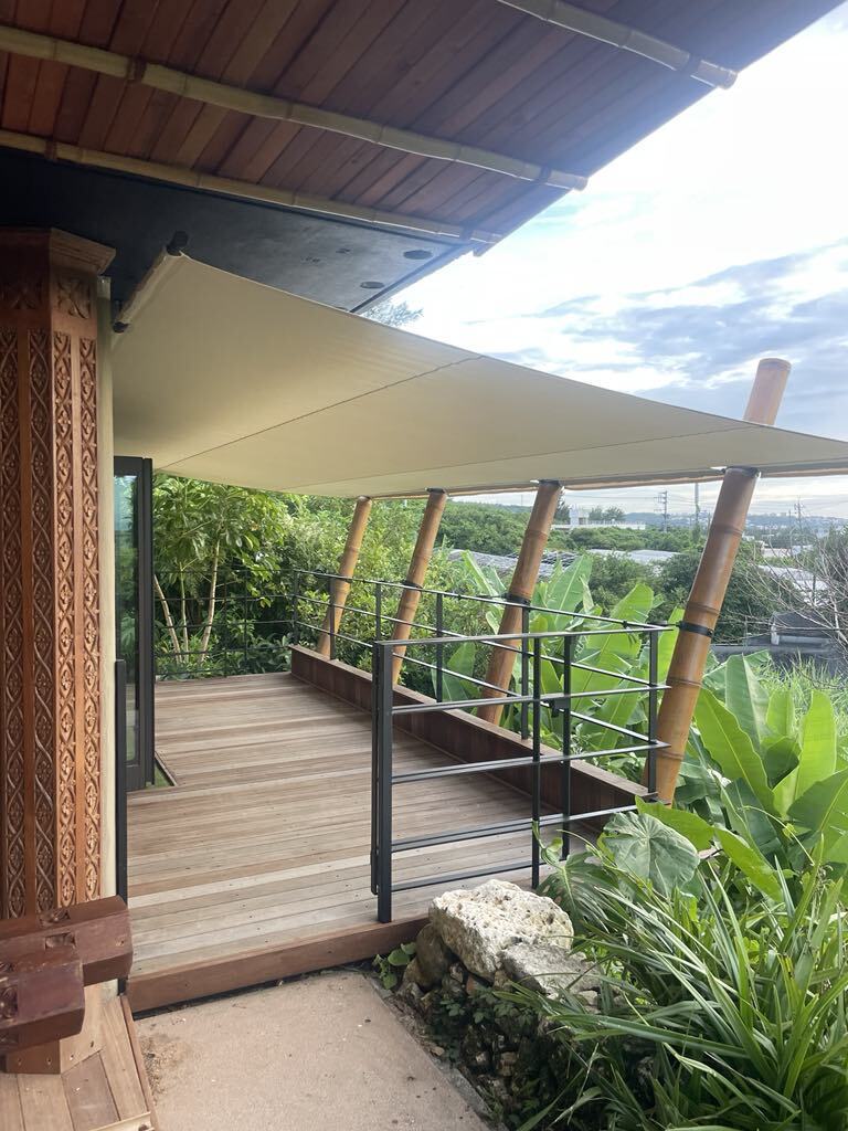 Baliのアンティークな手彫り木材や竹を使い、バルコニーは帆布の日除けでやわらかく心地良い空間になりました。