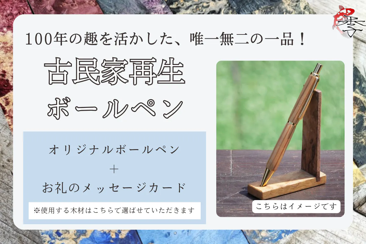 築100年の古民家を再生する際に出た廃材を活用して製作したオリジナルボールペンと、お礼のメッセージカードをお届けします。長い年月を経て味わいを増した木の風合いを活かし、1本ずつ丁寧に手作業で仕上げた唯一無二の一本です。