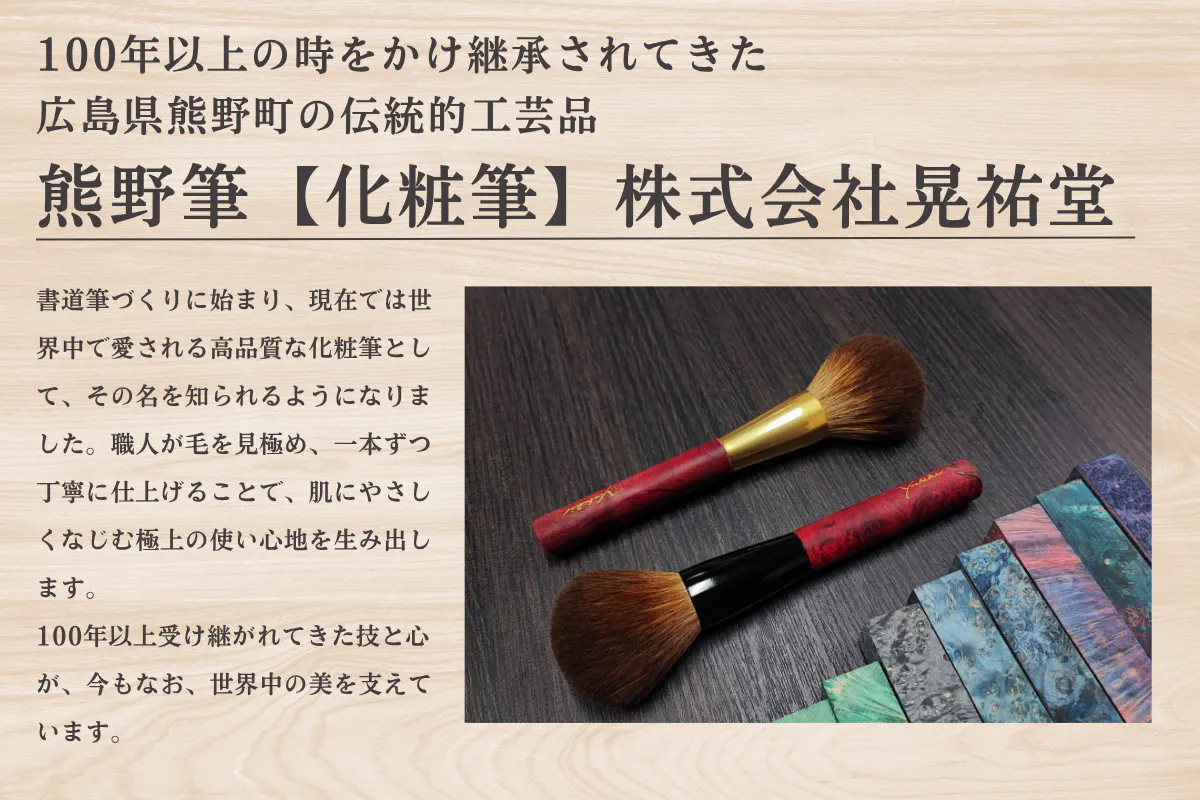 先日、広島を代表する伝統工芸品である熊野筆(化粧筆)の「株式会社晃祐堂」様より、スタビライズドウッドとのコラボレーション商品の企画についてご提案をいただきました。