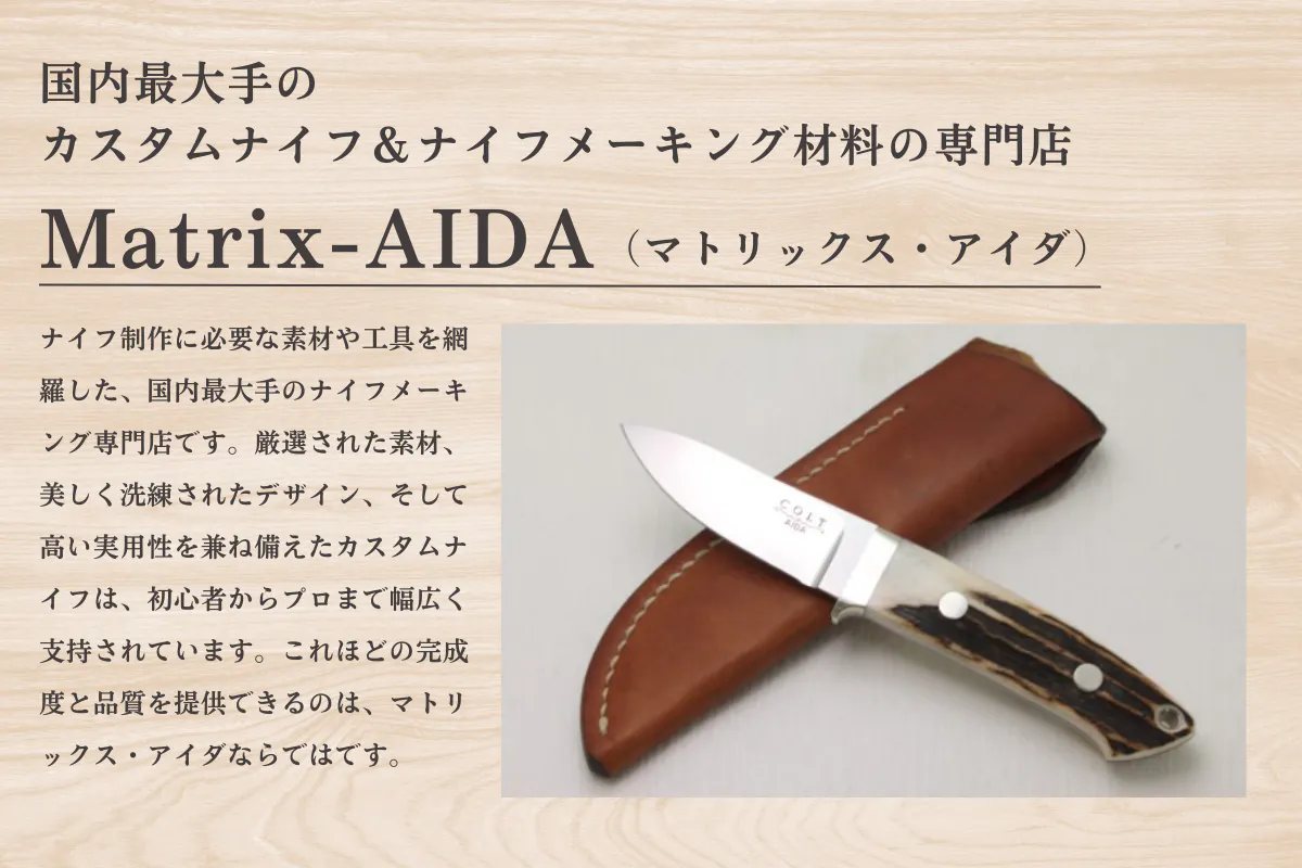ナイフ制作に必要な素材や工具を網羅した、国内最大手のナイフメーキング専門店である「Matrix-AIDA」様でも取り扱っていただいています。