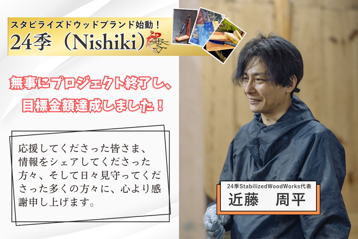 2025/11/27 11:24みなさま、こんにちは。24季(Nishiki) Stabilized Wood Works の近藤です。このたび実施していたクラウドファンディングプロジェクトが無事終了し、目標金額の247%(1,235,000円) という大変ありがたい結果を達成することができました。ここまで応援してくださった皆さま、情報をシェアしてくださった方々、そして日々見守ってくださった多くの方々に、心より感謝申し上げます。今回いただいたご支援と応援のおかげで、「スタビライズドウッド」という素材の魅力を、より多くの方に知っていただく大きな一歩となりました。プロジェクトは一区切りとなりましたが、24季(Nishiki)の挑戦はまだ始まったばかりです。今後の進捗や活動についても発信してまいりますので、引き続き見守っていただけますと幸いです。改めて、この場所から心よりお礼申し上げます。本当にありがとうございました。 もっと見る