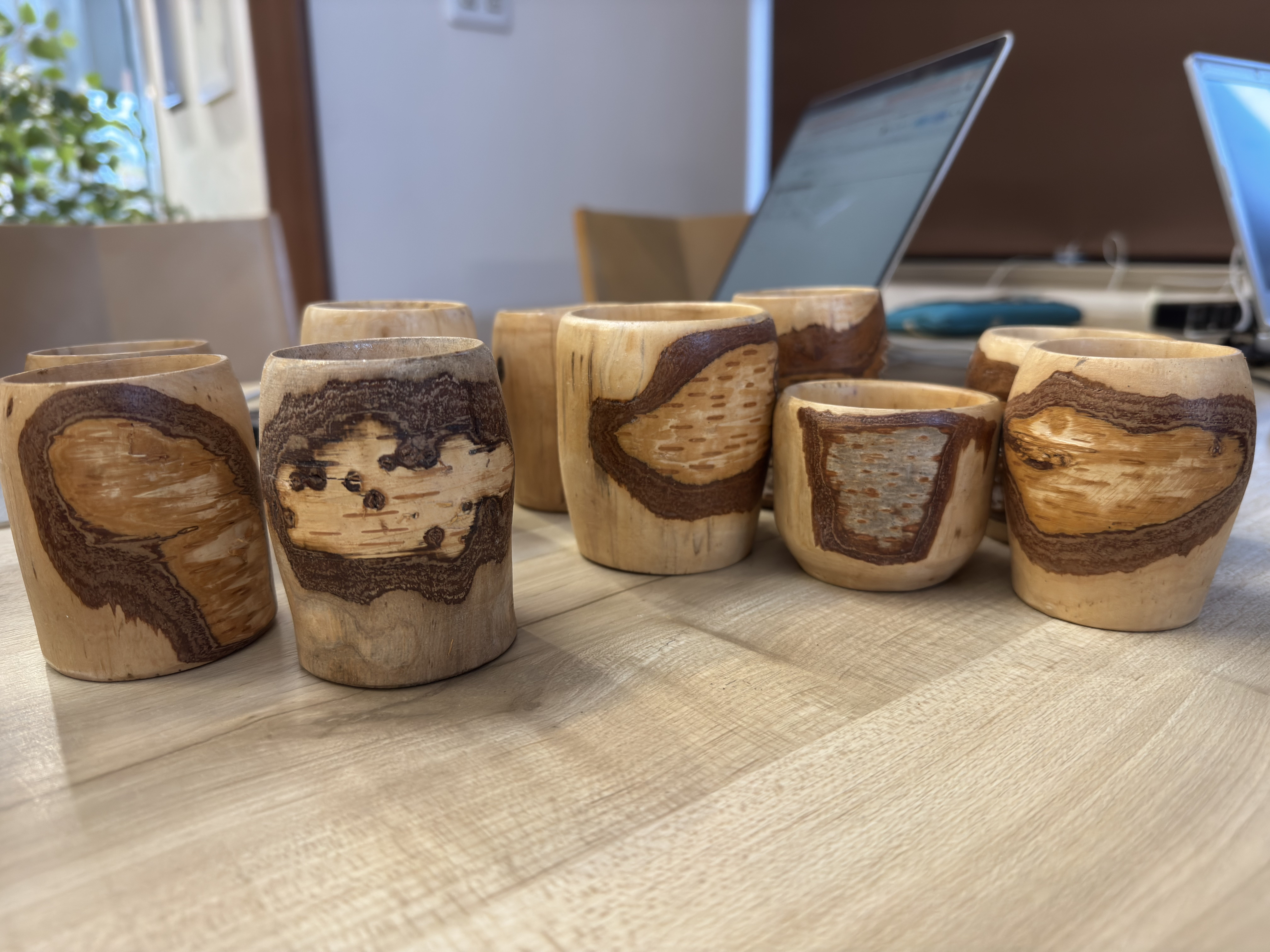 ぐい呑みセットのリターンの白樺の枝から地元の木工の匠が削り出したぐい呑みです。枝の太さ白樺の樹皮の風合いを生かして、すべて違う形の一点ものになります。