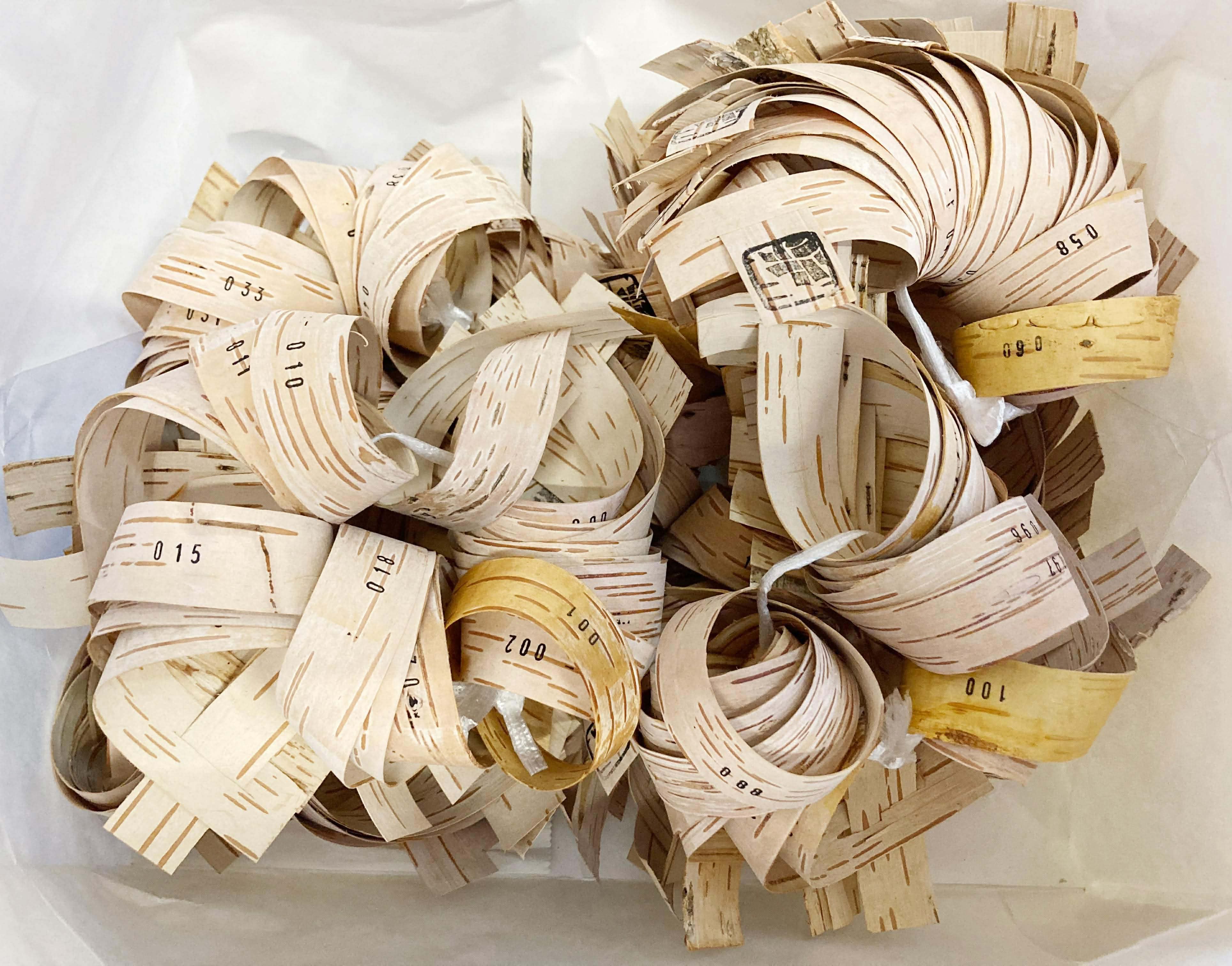 上の写真は、瓶の首に巻くボトルリボンです。天然の白樺樹皮でひとつひとつ手作りしました。リボンにはクラウドファンディング限定品の証としてシリアルナンバーが入っております。そして、ボトルの裏面に貼る食品表示ラベルも完成。