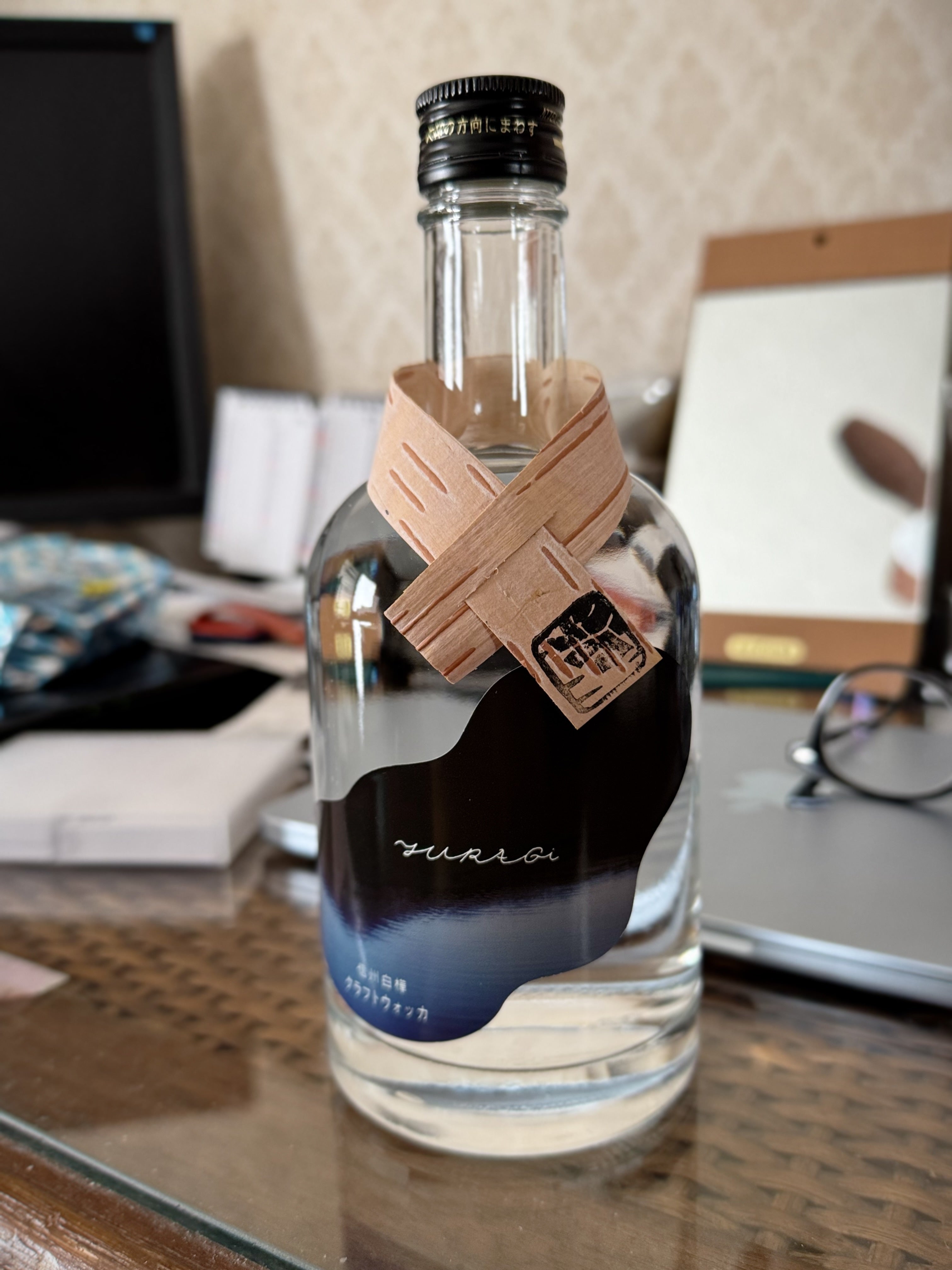 首に巻かれたタグは樹皮細工に使っている天然の白樺材です