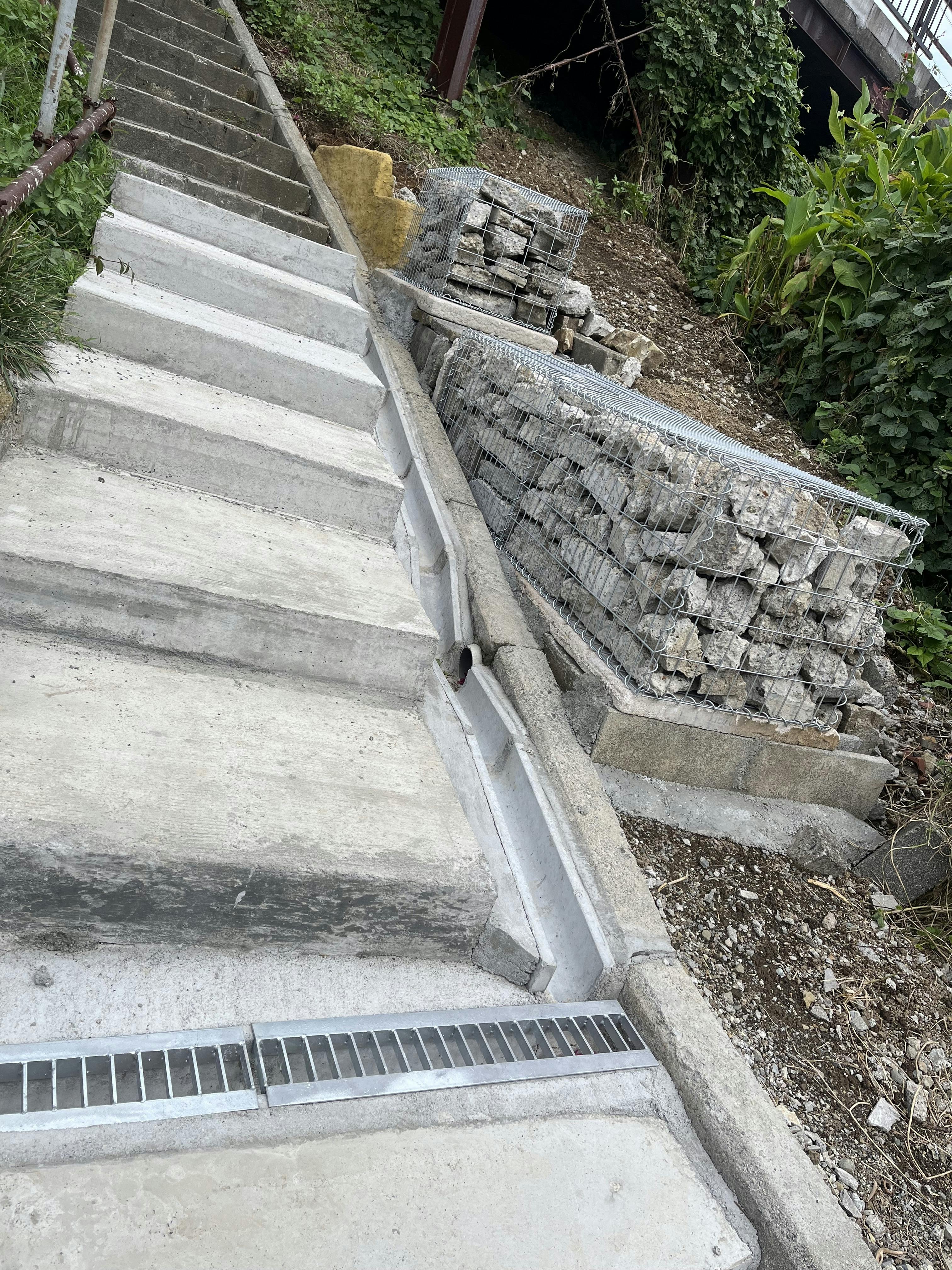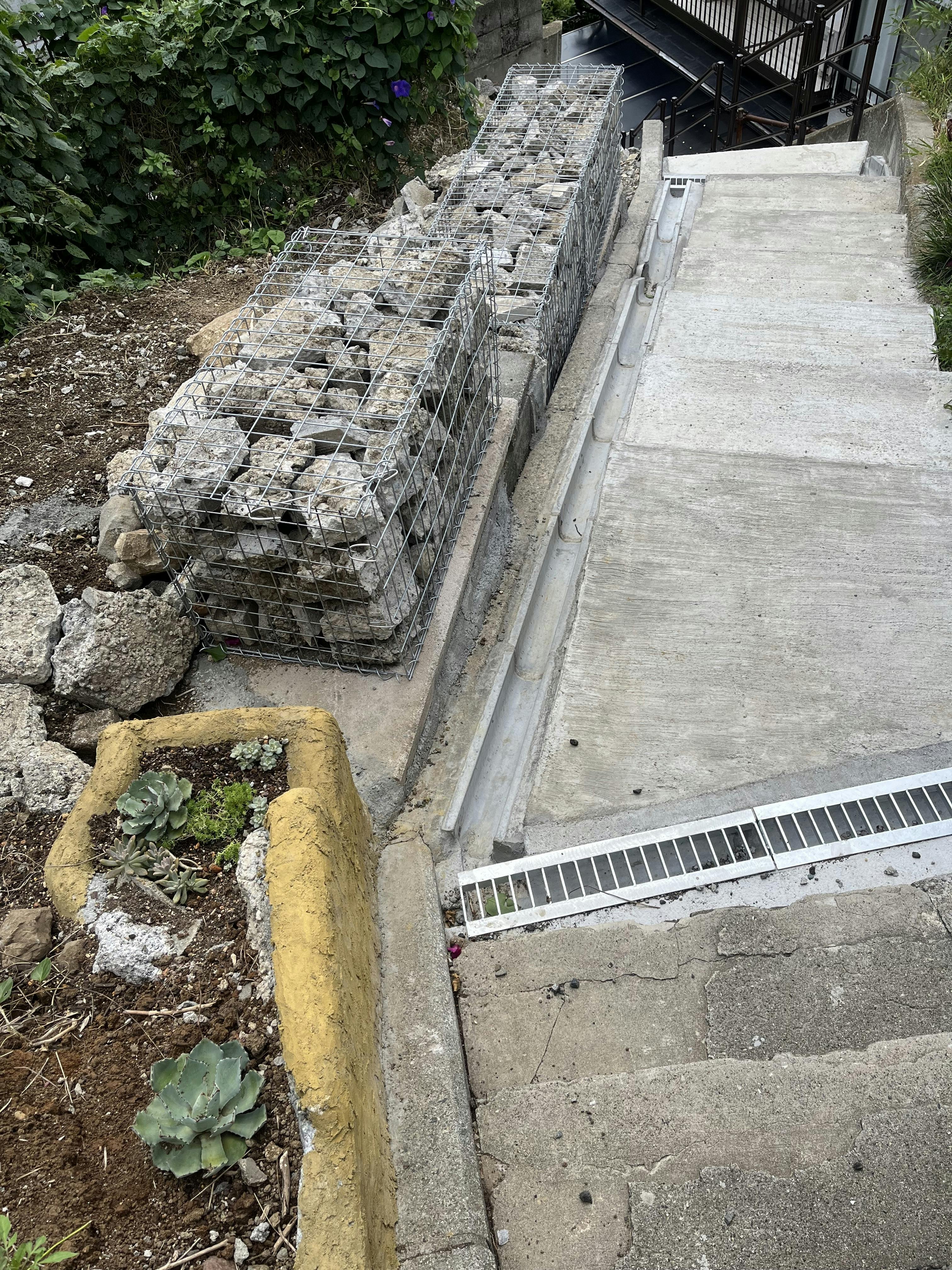 階段の中腹部分に、ガビオンウォール(ワイヤー製のカゴに石を詰めた壁)を設置しました。