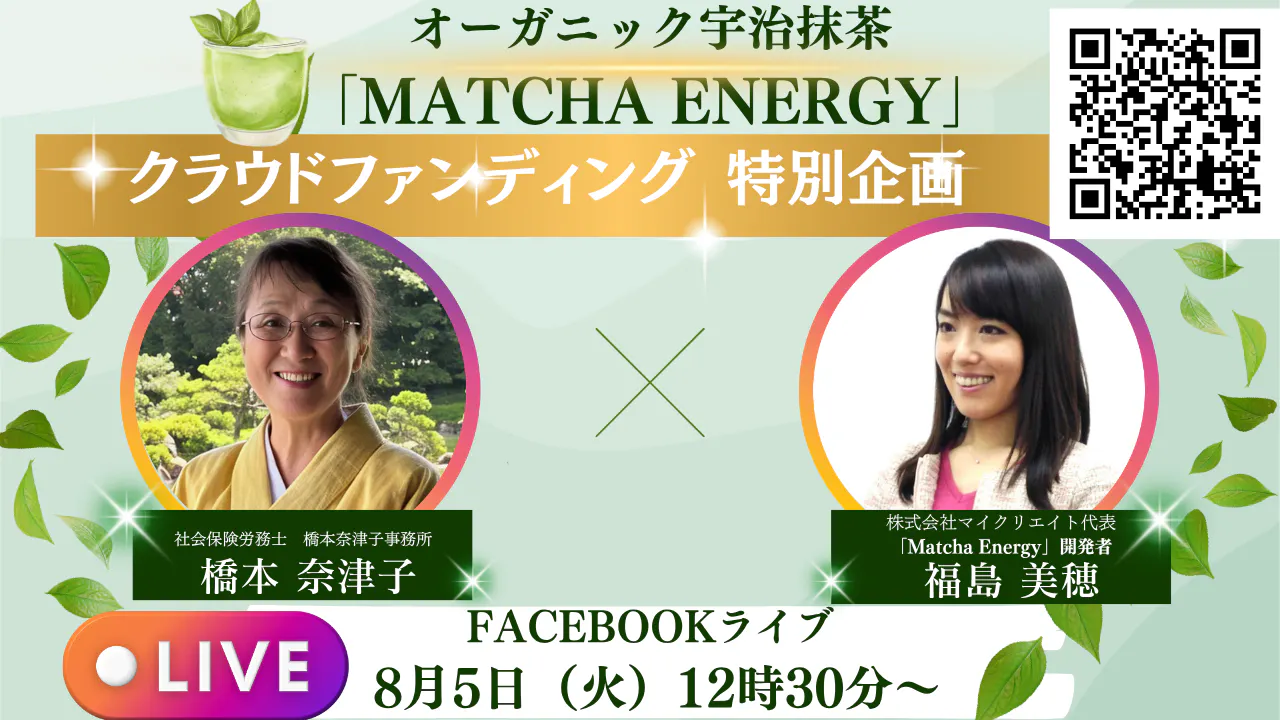 「午後のもう一頑張りを応援する抹茶エナジータイム」YouTubeライブを配信いたしました。忙しい毎日を送る社会保務士の橋本奈津子さんが、午後の頑張り方や仕事の秘訣、そして「Matcha Energy」を飲んでみての感じた驚きの効果について語っていただきました!