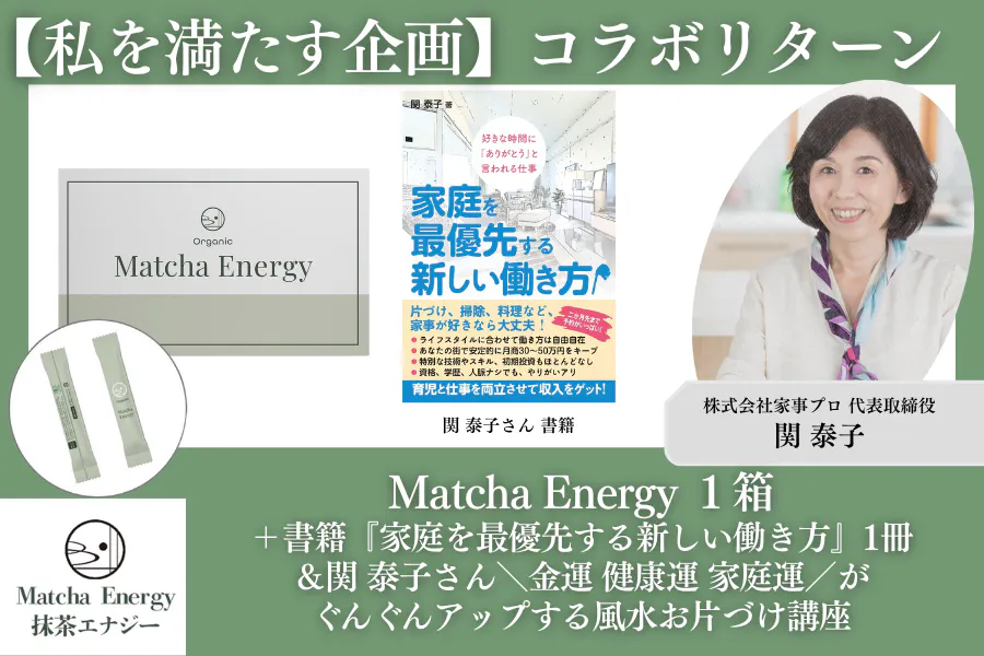忙しい毎日の中で、「私」を置き去りにしていませんか?このリターンは、あなたの心と体を整え、家庭も仕事も諦めない新しい働き方を見つけるきっかけになるでしょう。抹茶の穏やかな力と、風水の知恵で、あなたらしい幸せな未来を一緒にデザインしましょう!