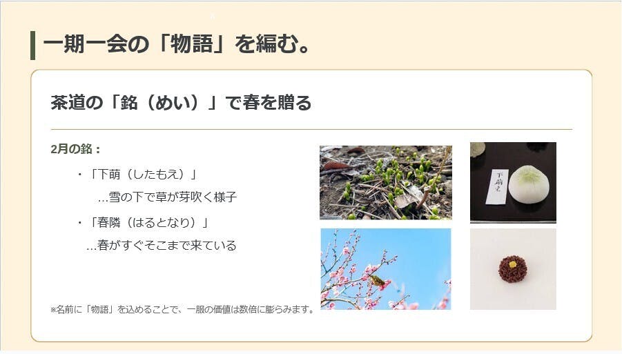 例えば、この時期なら「下萌(したもえ)」。雪の下で健気に芽吹く草花を想像しながらお茶を点てる。ただお茶を飲むだけでなく、そこに「物語」を添えることで、一服の価値が何倍にも膨らむ――。そんな「おもてなしの神髄」をアンバサダーの皆様と再確認しました。