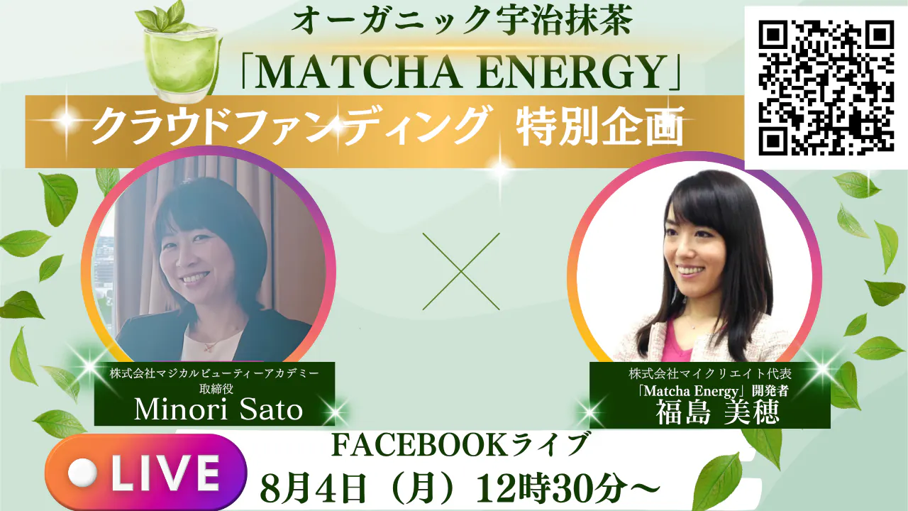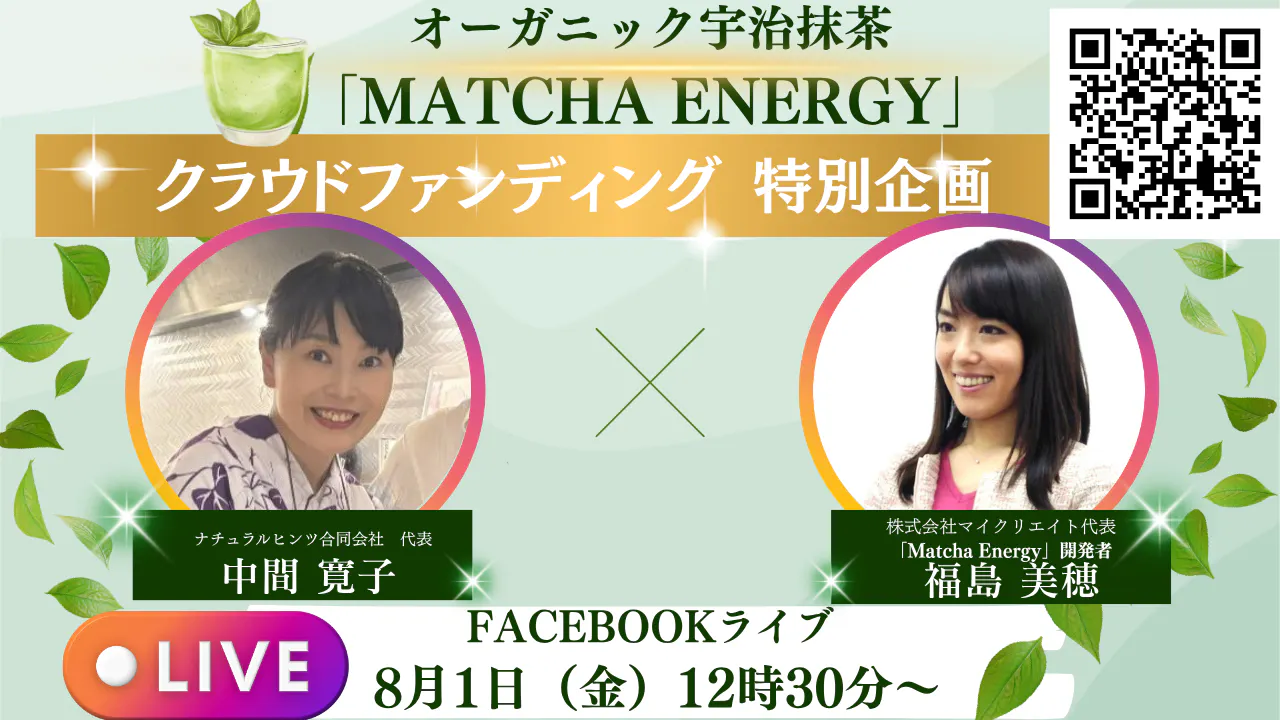 皆さま、こんにちは!“午後のもうひと頑張り”を応援する「抹茶エナジータイム」。第4回目のゲストとして、社会保険労務士 橋本奈津子さんをお迎えします!穏やかで優しい笑顔が魅力的!橋本奈津子さん。奈津子さんは、社会保険労務士さんとして、中小企業の人事・労務のサポートを実践。助成金の活用にも注力されていいます。企業のお困りごとに丁寧に耳を傾け、さまざまな工夫をして“道”を作り「人材を活かす」専門家として、絶大な信頼を獲得されています!今回は、そんな奈津子さんに「午後のオンにするための秘訣・工夫」と「Macha Energy(抹茶エナジー)」のご感想を伺います^^また、「Macha Energy(抹茶エナジー)」のイベントにも参加していただきました!配信では、第一線で活躍する奈津子さんの「午後のスイッチをオンにするための秘訣・工夫」Macha Energyを実際に飲んでみたご感想など、ここでしか聞けないお話をたっぷりお伺いします。ランチタイムのお供に、ぜひお気軽にご覧いただき、コメントでご参加いただけると嬉しいです。【配信日時】8月5日(火) 12:30 スタート【配信場所】https://www.facebook.com/events/762826836203566時間になりましたら、ぜひ覗きに来てくださいね!皆さまと画面越しにお会いできるのを、心から楽しみにしています!▼プロジェクトページも引き続きよろしくお願いいたします!▼https://camp-fire.jp/projects/862023/view?utm_campaign=cp_po_share_c_msg_mypage_projects_show