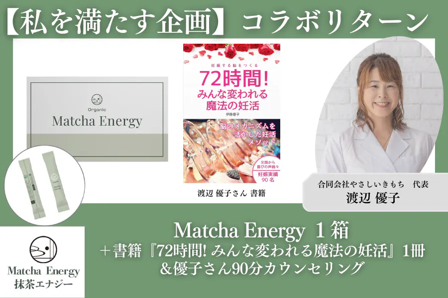 皆様、いつもオリジナル抹茶「Matcha Energy」クラウドファンディングプロジェクトへの温かいご支援、誠にありがとうございます!【私を満たす企画コラボリターン】として、それぞれの分野でご活躍されている素晴らしい皆様との特別なコラボレーションの追加リターンをご紹介させていただきます。Macha Energy 1箱 + 渡辺優子さん 著書「72時間! みんな変われる魔法の妊活」+90分オンラインカウンセリング深い癒しと、前へ進むためのエネルギーをあなたへ。「Macha Energy」とともに、あなたの心と体を優しく整える、特別な時間をお届けします。なんと、通常99,000円で提供している90分のカウンセリングに、Macha Energy(1箱)と書籍を付けて、【22,000円】という特別な価格でご提供します。■ 体の内側から、静かな自信と潤いを。まずは「Macha Energy」で、一杯の抹茶が持つ栄養と豊かな香りを体へ届け、毎日のリズムに穏やかな活力を与えます。そして、看護師・妊活アドバイザーの渡辺優子さんの著作で、心へのアプローチを。40代からの妊活にも希望の光を灯す一冊です。さらに、90分のオンライン個別カウンセリングでは、あなたの身体と心の状態を丁寧に紐解き、妊娠につながる栄養や生活習慣、自律神経の調整についても、具体的なアドバイスをお届けします。<渡辺 優子さん>不妊治療アドバイザー / 合同会社やさしいきもち 代表 / 一般社団法人メディカルマインドサポート協会 代表理事看護師として13年の臨床経験を経て、妊活専門カウンセラーとして独立。100名以上のセラピストを育成し、40代を含め130名以上の妊娠報告実績を持つ。体外受精で49歳、自然妊娠で44歳という実績もあり、著書『みんな変われる魔法の妊活』は重版を重ねる。半年以内にママになる妊娠セラピー動画 :https://x.gd/yAncw書籍「72時間変われる魔法の妊活」:https://x.gd/IzOKr<渡辺 優子さんからのメッセージ>これから妊活を始める人も、婚活中で結婚したら絶対赤ちゃん欲しい人も、現在妊活中の方も、ぜひ病院が教えてくれない妊娠への秘訣を沢山お話していきますので、あなたの今の悩みを教えて下さいね☆ 内容:Macha Energy 1箱 / 著書『72時間! みんな変われる魔法の妊活』1冊 / 渡辺優子さんとの90分カウンセリング(オンライン)22,000円(送料・税込)ご利用の流れ:オンラインカウンセリングの日時調整はリターン協力者との間で連絡を取り合い決めます。引き続き、「Matcha Energy」クラウドファンディングプロジェクトへのあたたかいご支援をどうぞよろしくお願いいたします!▼最大1000円引!「Matcha Energy」クラウドファンディングはこちらからhttps://camp-fire.jp/projects/862023/view?ctoken=Zj0xPKbmT8aTxhO3