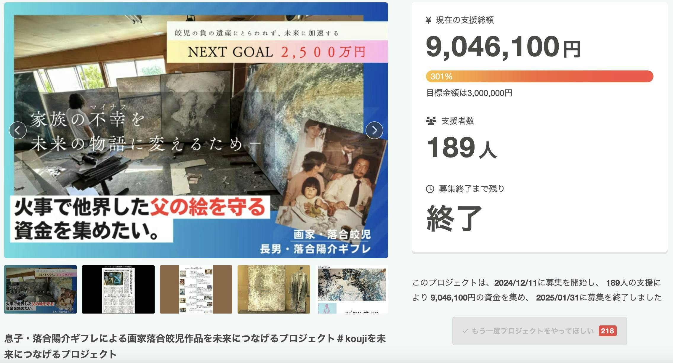 いただいたご支援は、火災後の片づけや作品の整理をはじめ、父・落合皎児の名を冠した「一般社団法人プロジェクト皎」の設立、さらには先述の「上野の森美術館ギャラリー」での回顧展の実現へとつながりました。