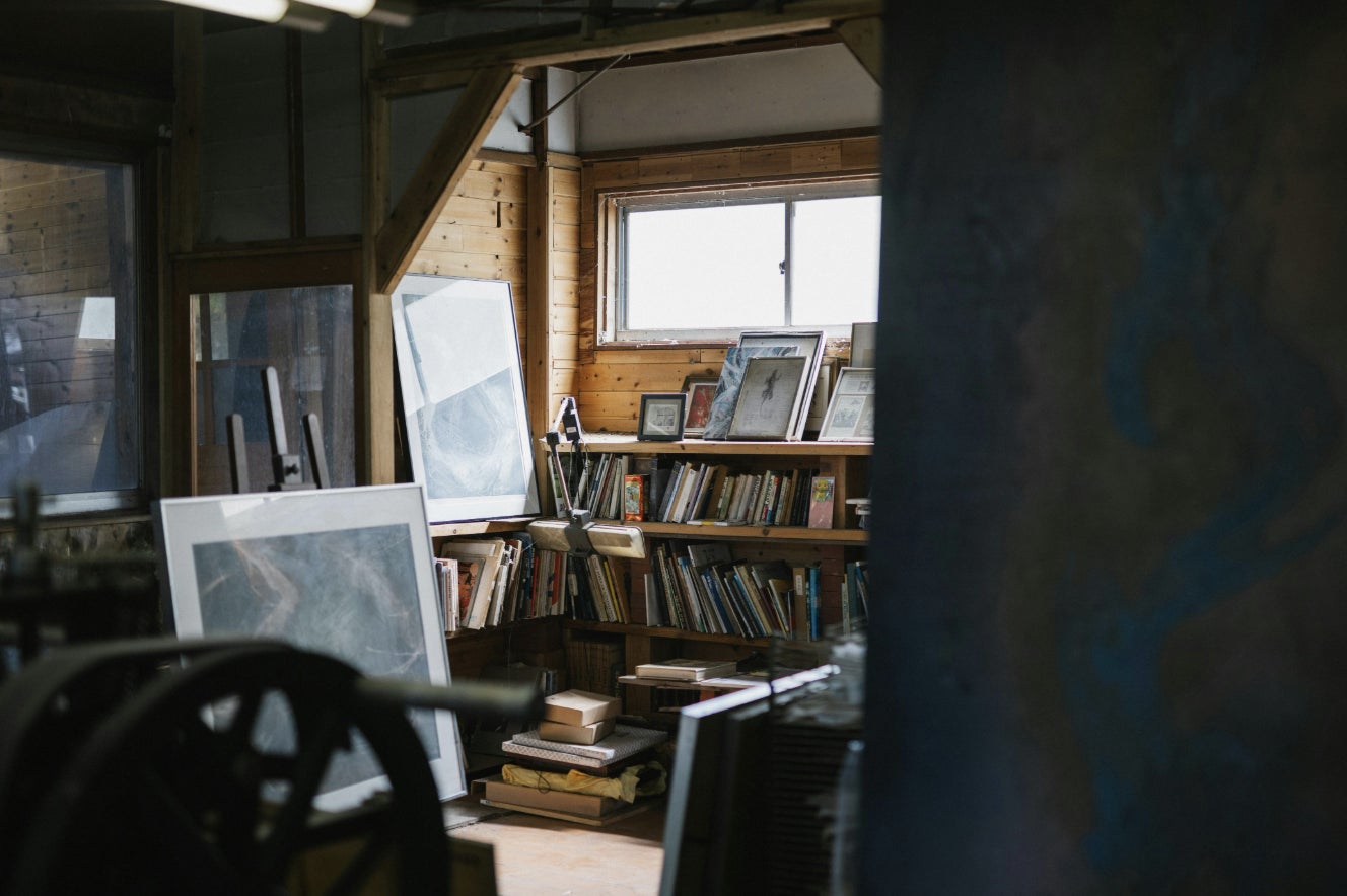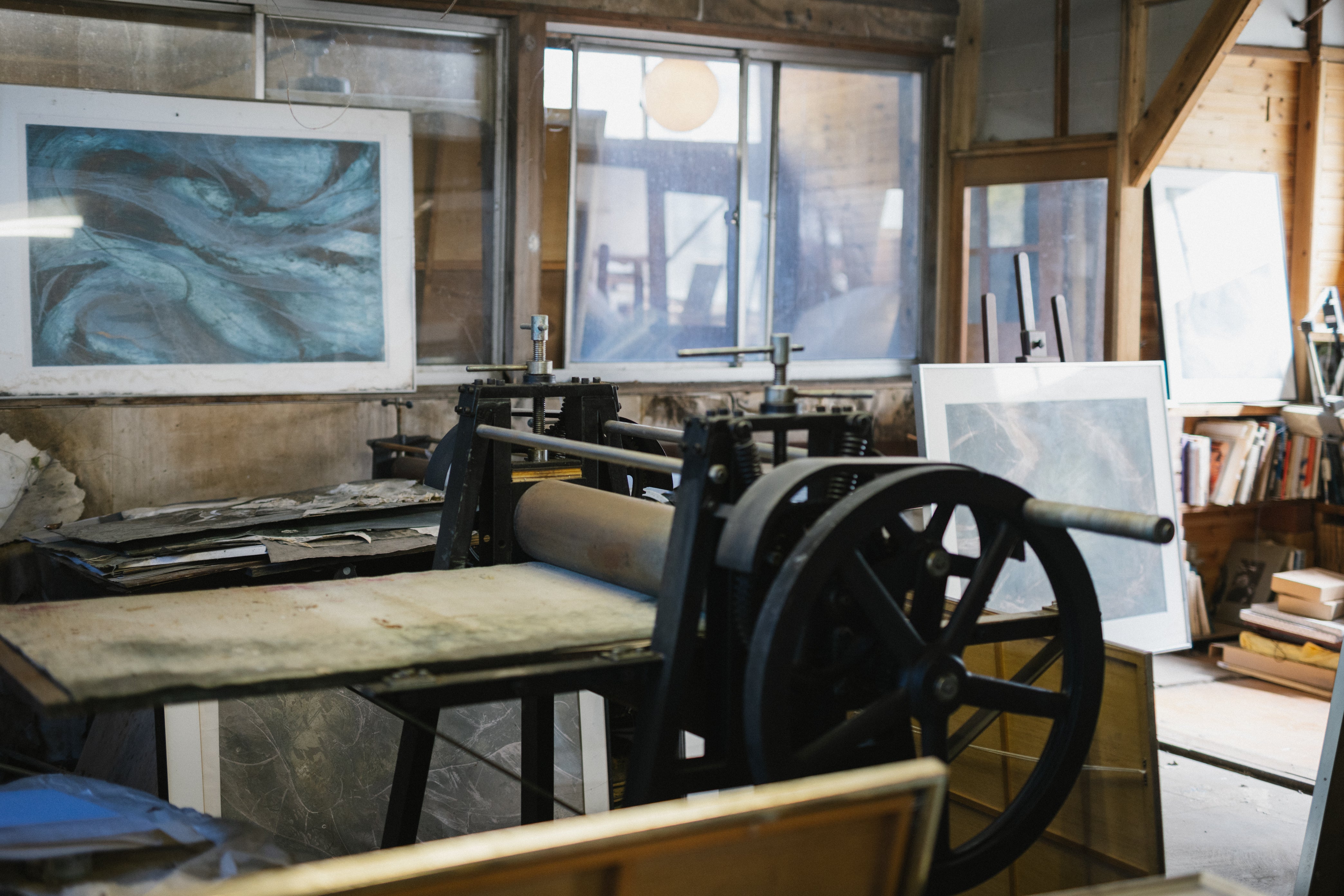 アトリエのプレス機を確認する版画家・上原修一氏一般的にはちょっとマイナー感が否めない版画ですが、落合皎児は元を辿れば版画職人からキャリアをスタートさせています。そんな落合皎児の本質でもある「版画」の魅力を発信し、知ってもらうことも大切にしていきたいことの一つですので、定期的なワークショップとしてアトリエ活用の軸にいきたいと考えています。