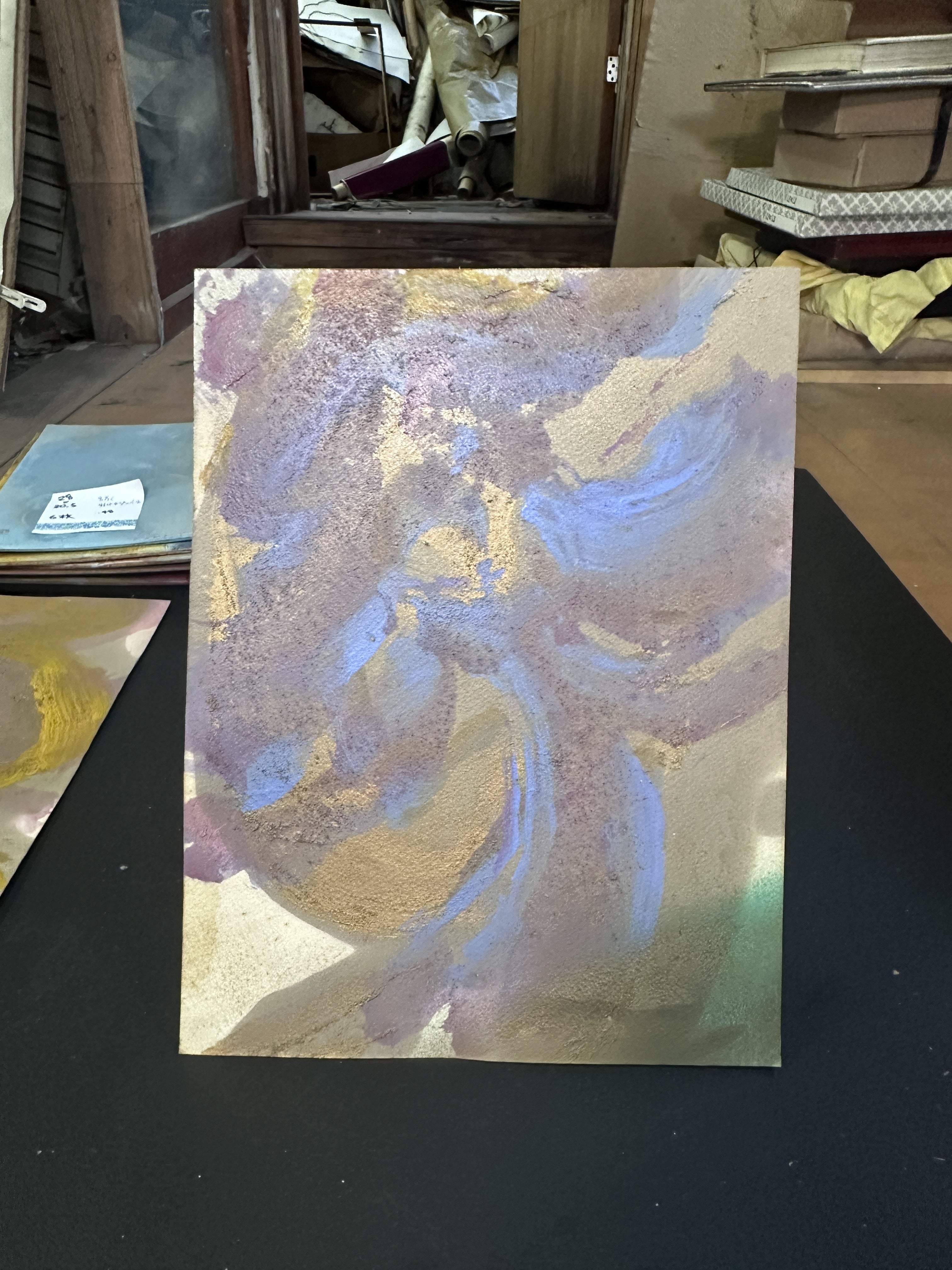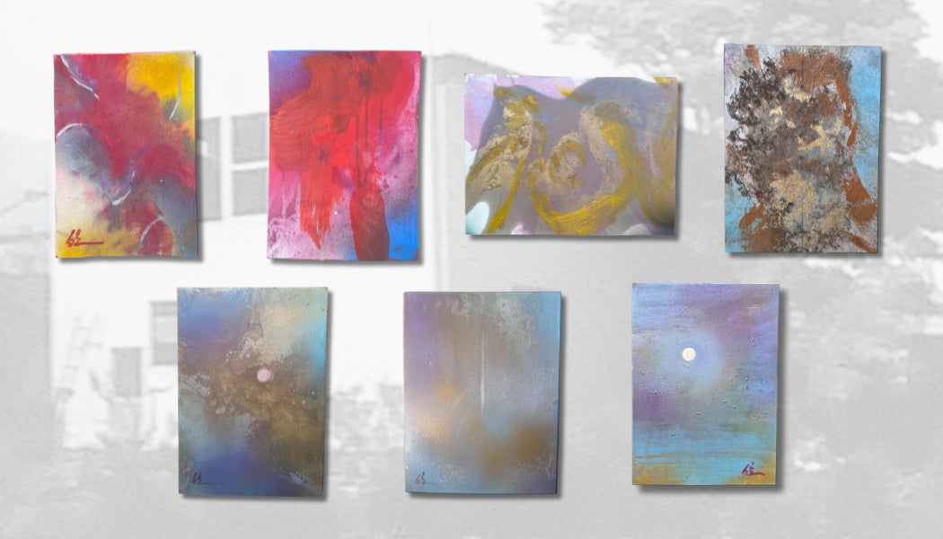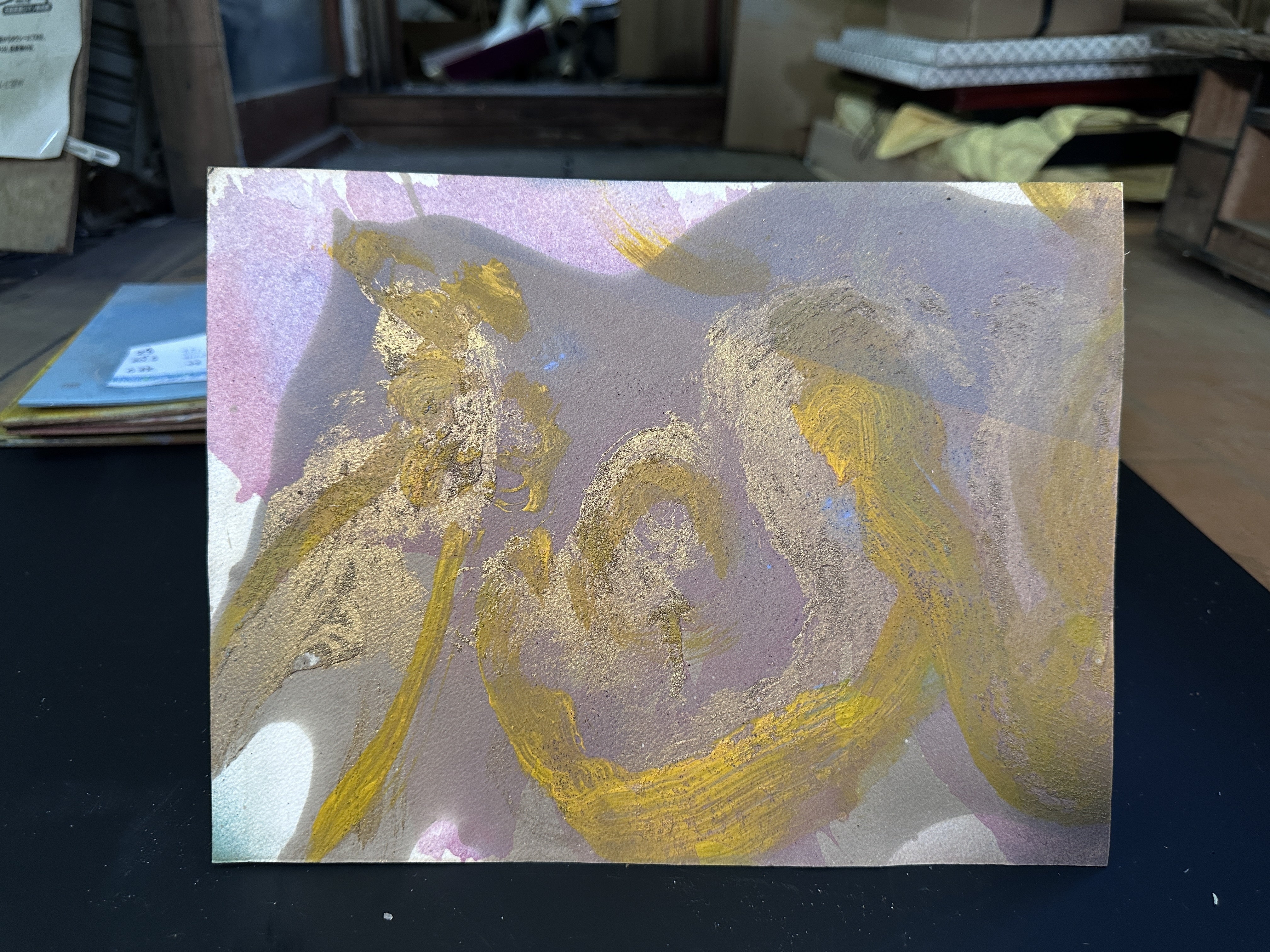 これは晩年の父が、額縁に使われるマットの端切れを集めて水彩や油彩、メディウムなどを織り交ぜて描いていたもので、小さいながらも父の世界観が凝縮されたものになります。