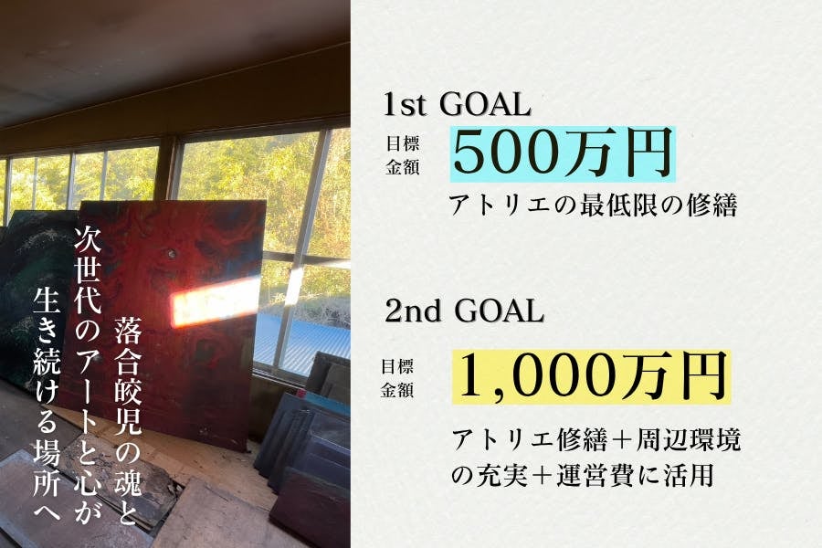 この金額で最低限の修復を目指し、目標金額を上回った場合は予算の追加および、庭や建物周りの修繕・美化、そしてアトリエの運営費に役立てるため、セカンドゴールを1000万円と設定しました。