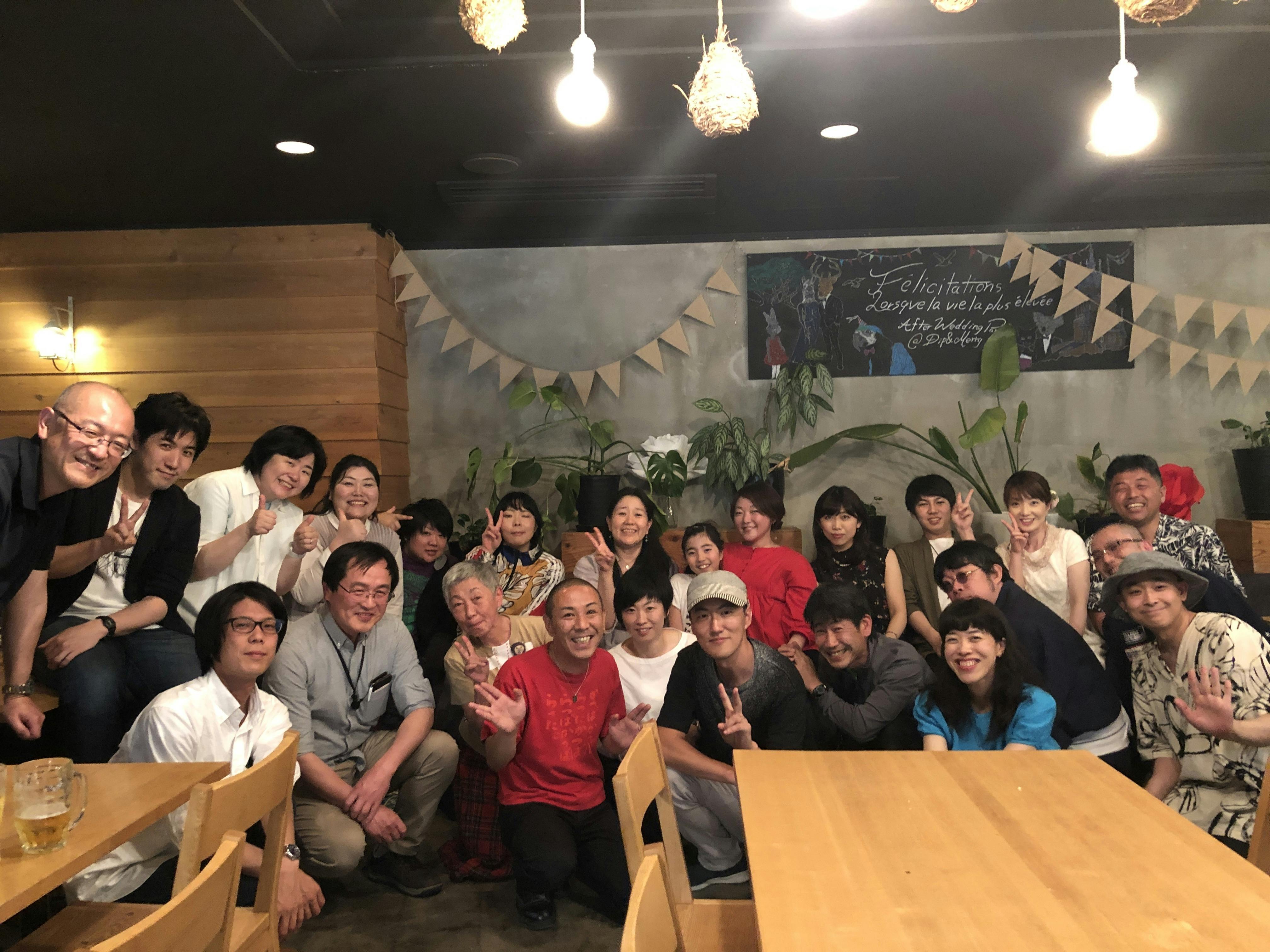 翌年の2019年5月。活動報告では何度もご紹介している「俊読2019」に三角さんもご登場いただきました。俊太郎さん・覚和歌子さんによる対詩の前という順番で、「こんな大トリに…」と、何度も桑原さんに意見(?)しているのが不思議と面白く。朗読されたのは、ご本人の作品「ユニバース」「とりとめなく庭が 」、俊太郎さんの「朝のリレー」。声を重ねていくループマシンを使っての朗読は、とても幻想的でした。(写真は打ち上げにて)