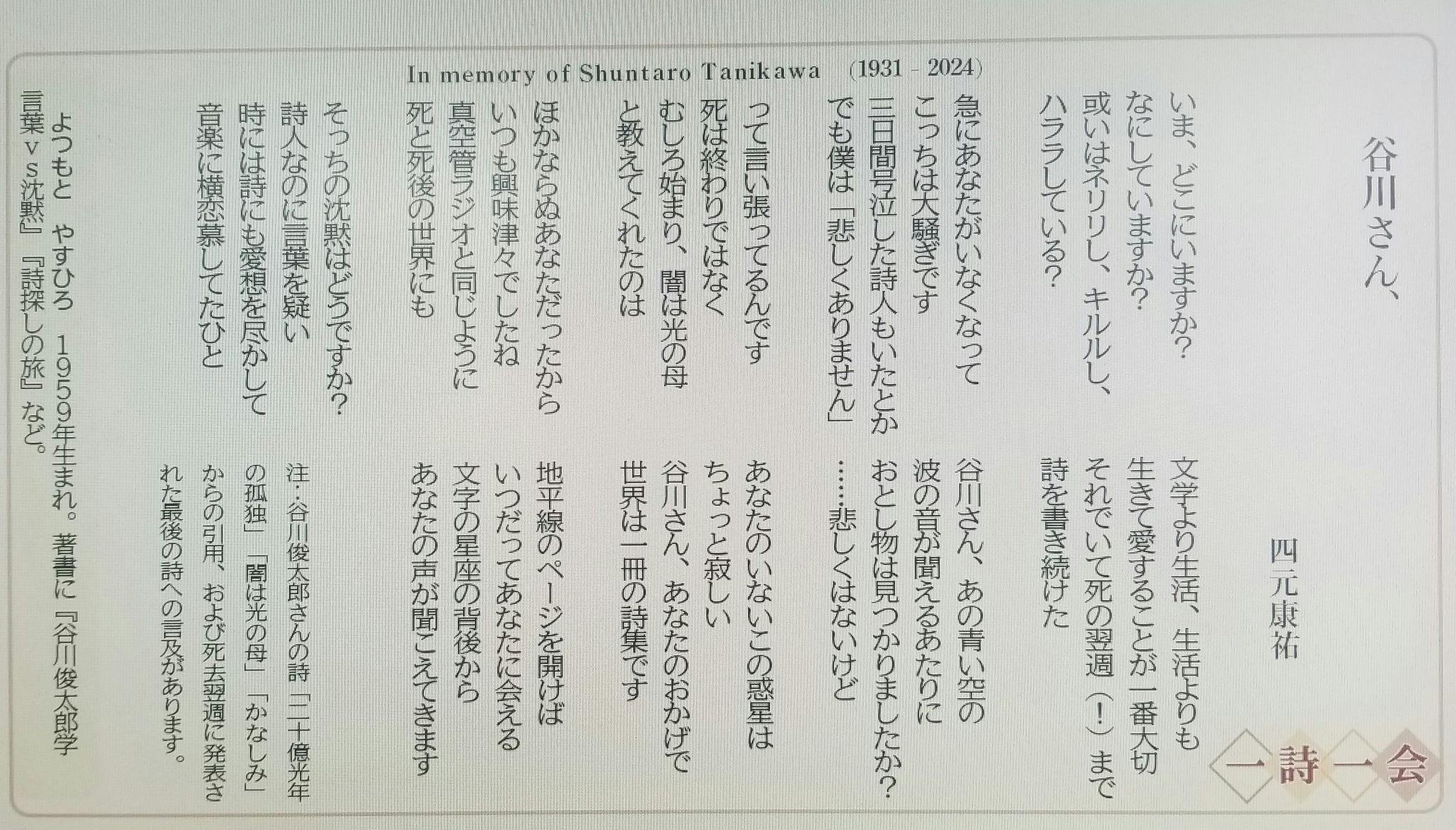 次に四元さんの文章を読んだのは、俊太郎さんが旅立たれてのち朝日新聞に載ったインタビューの言葉、そして心に深く響いたのは、今年1月に四元さんがSNSにアップしていた追悼詩(西日本新聞掲載)でした。(画像ご本人のfacebookより拝借)