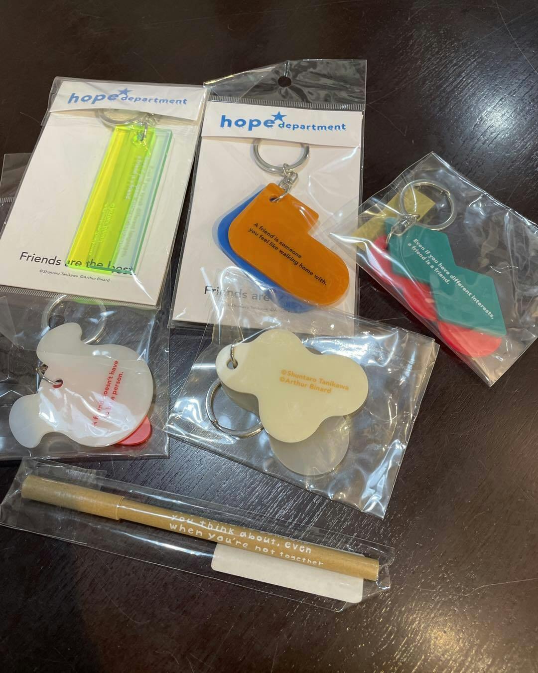 このとき、全国巡回中の「谷川俊太郎★絵本百貨展」のキーホルダーの話に。俊太郎さんが和田誠さんと一緒に作った『ともだち』という詩集を英語に翻訳したのがアーサーさんなのですが、「そこからいくつかの英文がキーホルダーになったんだよ」と。前年4月に、まこりんと一緒に絵本百貨展には行きまして、グッズはいくつも買ったのですが、キーホルダーは種類が多く、選びきれず諦めた商品でした。「よかったら今度持ってくるよ」。そう言ってくださったのでした。