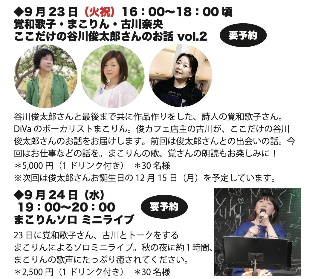 先週も一度ご案内いたしましたが、来週23日(火祝)は覚和歌子さん、まこりん、古川の3人で、トークイベント「ここだけの谷川俊太郎さんのお話」を俊カフェにて開催します。