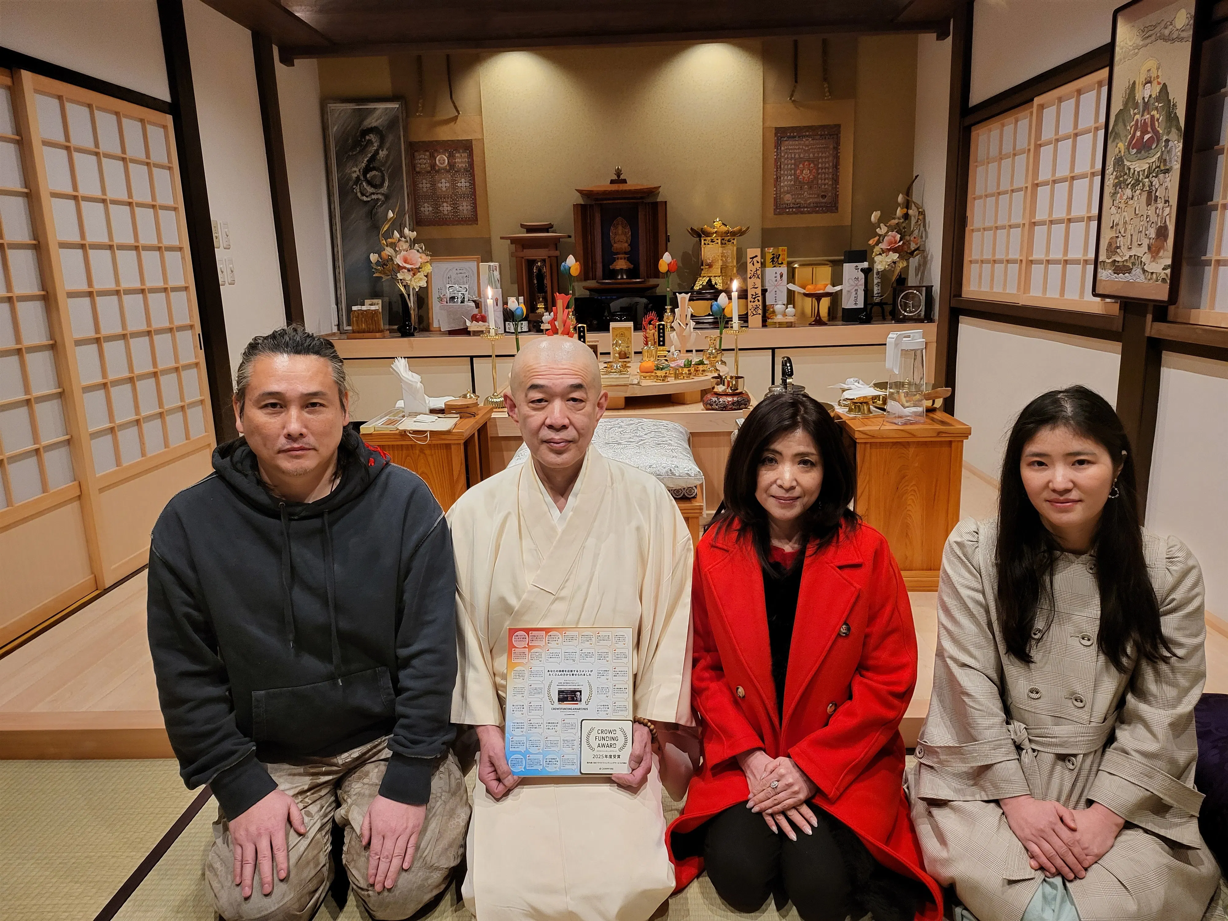 2026/03/17 20:00クラファン企画実行しました松岡恵利子です。このたび、心華寺金港辯財天に坂口拓さんが遊びに来てくださいました。今回のクラウドファンディングの発端は、坂口拓さん、太田誉志さん、石井東吾さんが心華寺金港辯財天を訪れてくださり、不滅の法灯のお堂再建についてお話しした際に、「クラウドファンディングをやりましょう」「僕たちはお金はいらないので、無償で出演します」「イベントも手伝わせてください」とお声がけいただいたことでした。このご縁がなければ、今回のクラウドファンディングが始まることはありませんでした。そしてお三方のお力添えのおかげで、クラウドファンディングは無事、目標を達成することができました。本当に、本当にありがとうございます。感謝の気持ちは言葉ではとても伝えきれませんが、こうしてご縁をつないでくださったこと、心より感謝しております。このご縁を大切に、これからも不滅の法灯を守り、つないでまいります。改めまして、関わってくださったすべての皆さまに心から御礼申し上げます。【写真】左から敬称略リアルアクション俳優 坂口拓心華寺金港辯財天住職 岡田道顕クラウドファンディング応援団長 シャーマンまゆみクラウドファンディング企画実行 松岡恵利子 もっと見る【12月20日開催】シャーマンまゆみ トーク&写真・サイン会の詳細が決まりました