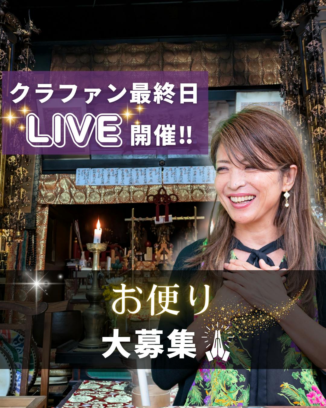 ご支援者の皆さまへこのたびは心華寺クラウドファンディングに温かいご寄進を賜り、心より感謝申し上げます。皆さまのお力添えにより、ここまで歩みを進めることができました。さて、いよいよ 9月7日(日)、クラファン最終日を迎えます。当日10時より心華寺での法要の様子、そしてシャーマンまゆみによる精神統一の時間を、YouTubeライブにて生配信いたします。▶配信はシャーマンまゆみのYoutubeからご覧いただけますさらに今回、皆さまと分かち合う特別企画として、クラファンを通じて 実際に体験された「奇跡」や「うれしい変化」 のエピソードを募集いたします。・体調や心の変化・ご家族との関係の改善・不思議なご縁や出会いなどどのような小さな気づきでも結構です。お寄せいただいたエピソードは、9月7日のLIVE内にてご紹介させていただく場合がございます。ご応募はこちらのフォームよりお願いいたします皆さまお一人おひとりの体験が、多くの方々にとっての希望の光となると信じております。最終日を迎えるにあたり、共に奇跡を分かち合えることを心より楽しみにしております。