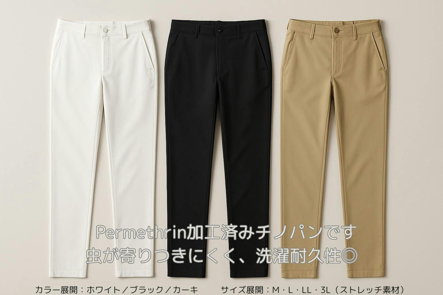 防虫加工は、繊維に定着させる加工を行っており、使用状況や洗濯頻度により異なりますが、一定の耐久性があるとされています(※効果の感じ方には個人差があります)。また、Permethrinは登山用品やアウトドアウェアにも使われており、繊維に加工された状態での使用は安全性が高いとされています。肌に直接塗るものではないため、日常使用における刺激リスクは非常に低いとされています。