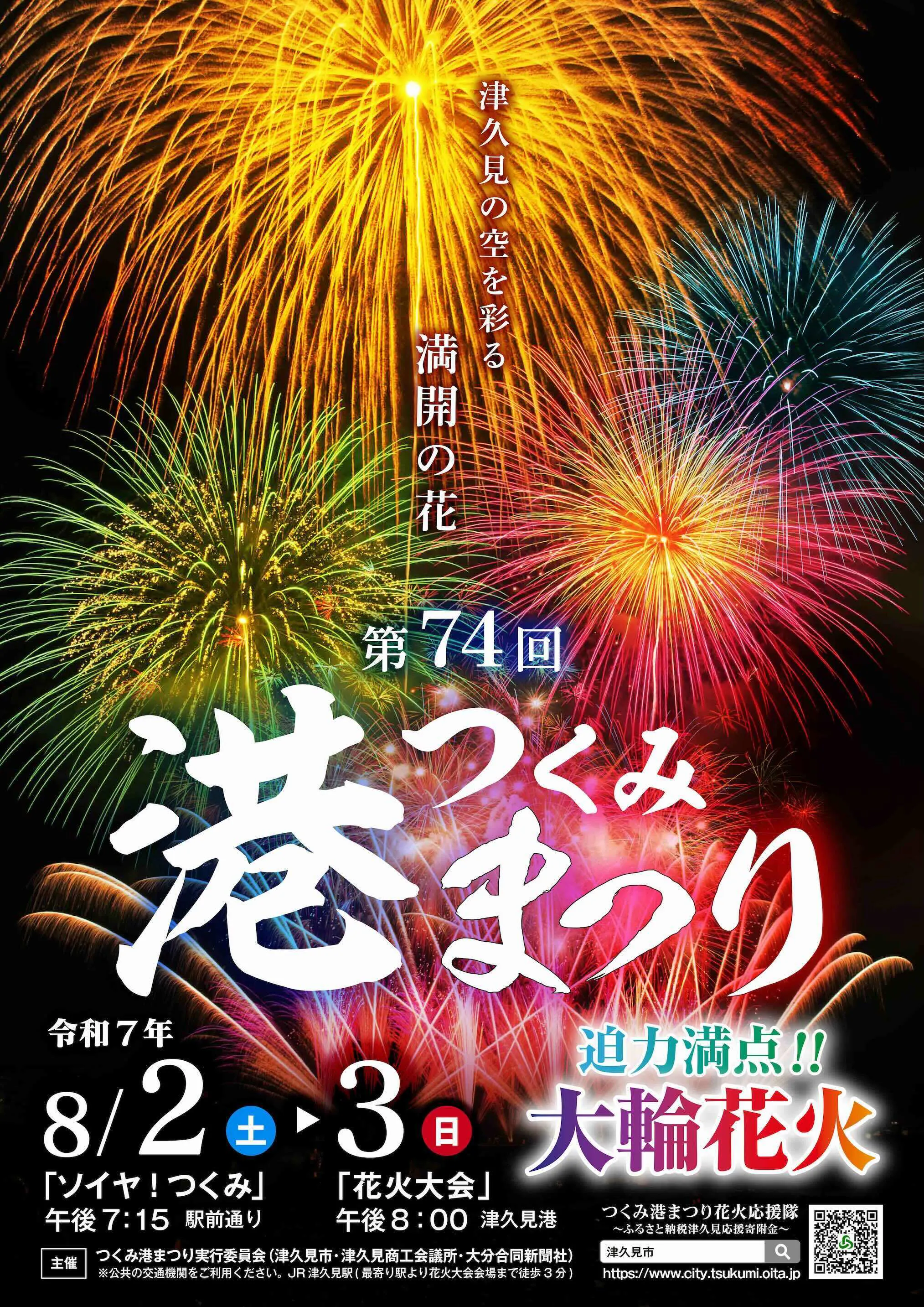 大分県津久見市で、夏の風物詩である市民が参加する踊りや花火大会を主催している「つくみ港まつり実行委員会」です。このお祭りは、昭和26年に重要港湾に指定されたことを契機に船舶の安全と豊漁を祈るために始まった祭りであり、今年で74回目を迎えます。特に花火大会は、毎年、多くの人々に楽しみにしており、津久見市の地域活性化に欠かせない重要なイベントです。